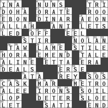 ACROSS 1. _ tizzy (2 wds.) 4. Religious women 8. Three (prefix) 11. Capital of the state of Qatar 13. Declaim 15. Friend of Pooh 16. Inky black, to poets 17. Middle Eastern gold or silver currency 18. A really long time 19. Assad's deity 21. Cuckoo 22. Allows 23. Directed 24. No longer planned or scheduled 27. Snakelike fish 29. Commotion 30. Pitcher Ryan 34. The 23rd letter of the Hebrew alphabet 36. Unable to walk 39. Vertical member of a panel or frame 40. Israeli folk dance 41. Make improvements or corrections to 43. Story 44. Place in a line 46. Singer James 47. Period 48. Allots cards 49. Celtic language 51. "One Day ___ Time" 53. Marina Del _, California 54. Mayday 57. Keg 60. Impair 63. Paris' subway 65. Toward shelter 66. Metal shackles 69. The visible part of the earth's surface 70. Trim (branches) 71. Prevent from occurring 72. A type of plum 73. Allow 74. Suttee (variant) 75. Conclude DOWN 1. Perfect 2. Impressive in appearance 3. Hold, grip (Informal) 4. Dreamland 5. RI univ. 6. Grandmother 7. Comedian Laurel of Laurel & Hardy 8. Relationship diagram 9. Carrot, for example 10. Charged atoms 12. Santa ___, CA 14. 4th largest of the Great Lakes 18. One to whom something is allotted 20. Being at a high temperature 25. Do some clerical work 26. Movie unit 28. Followers of ems 29. Tchaikovsky ballet 31. One who doesn't tell the truth 32. Silent film actress Nazimova 33. Born 34. Lacquered or enameled metalware 35. Roberta Peters solo 37. Was introduced to 38. Keyboard key 40. Possessed 42. Have the gumption 45. Eastern Standard Time (abbr.) 50. Symbol (abbr.) 52. Among 54. Took without asking 55. Constellation of myth 56. Having a sole or soles 57. Give a ring to 58. _ vera 59. Back-to-school mo. 61. Ancient Greek god of war 62. Round or rotation of duties 64. Curvy letter 67. Remaining after all deductions 68. Indian title of respect (Mr.)