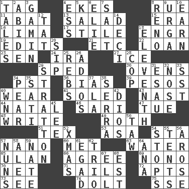 ACROSS 1. Label 4. Supplements with great effort 8. Sorrow 11. Blind as ____ 13. Vegetable dish 15. Period 16. Pale green bean 17. Vertical member of a panel or frame 18. Engineer (abbr.) 19. Prepares for publication 21. And so on (abbr.) 22. Grant temporary use of 23. Elected rep. 24. Retirement account (abbr.) 27. Frozen water 29. Moved rapidly 30. Baking chambers 34. Pacific Standard Time (abbr.) 36. Prejudice 39. Mexican monetary units 40. Put on (as clothing) 41. Having a sole or soles 43. Political cartoonist Thomas 44. Relating to or accompanying birth 46. Indian skirt 47. Third day of the wk. 48. Compose 49. Writer of Portnoy's Complaint (1969) 51. John Ritter's dad 53. White ___ sheet 54. R.R. building 57. Billionth: prefix 60. Was introduced to 63. Wetness 65. ____ Bator, Mongolia 66. Match 69. Words to Nanette 70. Fish or hair follower 71. Travels by water 72. Tenement units (abbr.) 73. Observe 74. Dunce 75. Compass dir. DOWN 1. Falsehoods 2. Tolerate 3. Homeless child 4. Double-curved letter 5. Krazy ___ of comics 6. Writer Wiesel 7. Table seasoning 8. Western Nevada city 9. Capital and largest city of Mongolia 10. Merit 12. Make lace 14. Tenth: prefix 18. Veterans Day date 20. Small drink 25. Confederate soldiers (slang) 26. Goodbye (Sp.) 28. Police officer (slang) 29. Ski resort town in Vermont 31. Son of Isaac 32. Sense of smell 33. Fast jet (abbr.) 34. Lightbulb-shaped fruit 35. Suttee (variant) 37. Wing 38. Spanish missionary in California 40. Compass dir. 42. "Vaya con ____" 45. Area sheltered from the wind 50. The 23rd letter of the Hebrew alphabet 52. Dec. holiday 54. Obstructs or blocks passage 55. Portable shelters 56. Came up 57. Religious women 58. Toward shelter 59. Nathan's nickname 61. Mild oath 62. Musical group of three 64. Santa ___, CA 67. Pipe bend 68. Eastern Standard Time (abbr.)