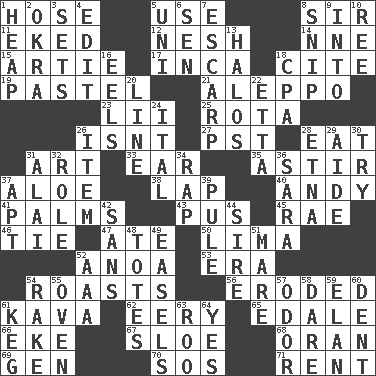 ACROSS 1. Flexible conduit 5. Purpose 8. Title for a knight 11. Supplemented with great effort 12. Soft 14. Compass dir. 15. Nick name for Arthur 17. South American Indian 18. Quote 19. Soft color 21. City in Syria 23. Cards in a Roman deck? 25. Roll call or roster of names 26. Is not 27. Pacific Standard Time (abbr.) 28. Ingest 31. Tate display 33. Hearing organ 35. Moving or stirring 37. _ vera 38. Infant locale 40. "60 Minutes" Commentator Rooney 41. Insides of hands 43. Fluid product of inflammation 45. Actress Charlotte 46. Standoff 47. Had dinner 50. Pale green bean 52. Small Philippine buffalo 53. Epoch 54. Cooks with dry heat, as in an oven 56. Eaten away 61. Polynesian shrub of the pepper family 62. Suggestive of the supernatural 65. Peak District village in England 66. Supplement with great effort 67. A type of plum 68. Northwest Algerian city 69. Commissioned mil. rank 70. Mayday 71. Monthly bill DOWN 1. Pile 2. Gumbo ingredient 3. Puts into a specified state 4. Prepare for publication 5. University (slang) 6. Elected rep. 7. Fortification 8. Sever or remove by pinching or nipping 9. To the inside or interior of 10. To sift 13. Radiant circles of light 16. Snakelike fish 18. Tax preparer (abbr.) 20. Actor's bit 22. Singer James 24. Slanted text style (abbr.) 26. Detail 28. Inactive volcano in Sicily 29. Helper 30. Attempt to accomplish something 31. Jai _ 32. Hero or heavy, e.g. 34. Hit sharply and swiftly 36. "Two Mules for Sister ____" 37. Fitting 39. Whine 42. Without 44. Title for a man of rank and authority 48. Lugs 49. Artist's stands 51. Female horse 52. American Automobile Association (abbr.) 54. Libertine 55. Baking chamber 57. Aroma 58. Have the gumption 59. Style 60. Undesirable depression on a surface 61. Cask 63. Friend of Pooh 64. Affirmative reply