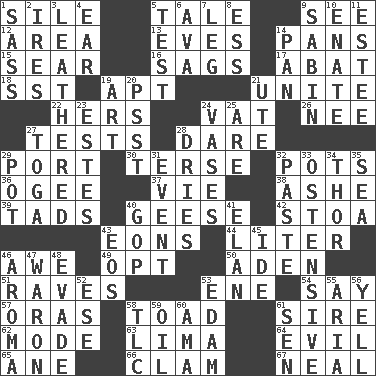 ACROSS 1. Drop; flow; fall 5. Falsehood 9. Perceive with the eye 12. Length times width 13. Nights before holidays 14. Zero-star reviews 15. Scorch 16. Sinks 17. Blind as ____ 18. Fast jet (abbr.) 19. Fitting 21. Join together 22. Possessive pronoun 24. Large container 26. Born 27. Trials 28. Have the gumption 29. Sweet dark-red dessert wine 30. Laconic 32. Plant holders 36. Double curve, resembling the letter S 37. Compete 38. American tennis player Robert 39. Small amounts or degrees 40. Honkers 42. Portico 43. Immeasurably long periods of time 44. 61 cubic inches 46. Deep reverence 49. Elect 50. Arabian gulf 51. All-night dance parties 53. Compass dir. 54. Declare 57. Mouths or openings 58. Frog relative 61. Father 62. Method 63. Pale green bean 64. Tending to cause great harm 65. A saturated hydrocarbon 66. Dollar (slang) 67. Anneal DOWN 1. Backtalk 2. Angers 3. Tough but pliablecoriaceous 4. Hearing organ 5. Trial 6. Actress Gardner 7. Part of a journey 8. Double-curved letter 9. Unit of acoustic absorption 10. Related on the mother's side 11. First name in cosmetics 14. Baking dish 19. Nonscientific branch of learning 20. Inconspicuous attention getter 21. Shoshoni 23. _____ Park, CO 24. Flower holders 25. "We ___ not amused" (Victoria) 27. Ancient Roman robe 28. Frees from moisture 29. Plant holder 31. Happening 32. Thick mixture 33. Clearly or manifestly demonstrative 34. Son of Odin 35. Ocean 40. Grand Old Party 41. Enthusiasm 43. Greek goddess of the dawn 45. Binary compound 46. Odor 47. Make _____ (do battle with) 48. Dodge 52. Compass dir. 53. Dutch treat 55. Roberta Peters solo 56. Shout 58. Affectionate concern, for short 59. Petroleum 60. Wet nurse (var.) 61. Elected rep.