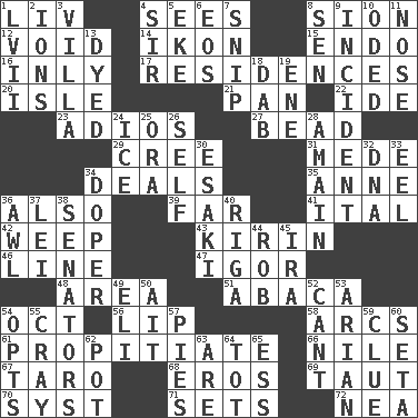 ACROSS 1. 54 in ancient Rome 4. Observes 8. The Jewish people; Israel 12. Lacking any legal or binding force 14. Image 15. Inside; within (prefix) 16. Inwardly 17. Homes 20. Capri or Wight 21. Baking dish 22. Binary compound 23. Goodbye (Sp.) 27. Necklace unit 29. Algonquian 31. Ancient Persian 34. Allots cards 35. Queen of England 1702-14 36. In addition 39. Distant 41. Slanted text style (abbr.) 42. Shed a tear 43. Japanese brewing company 46. Actor's bit 47. Russian composer Stravinsky 48. Length times width 51. Phillipine bananalike plant 54. Sep. follower 56. Mouth edge 58. Curves 61. Conciliate 66. Mediterranean tributary 67. Pacific island yam 68. Greek god of love 69. Drawn tight 70. System (abbr.) 71. Puts into a specified state 72. Teachers' org. DOWN 1. 57 in ancient Rome 2. Charged atoms 3. Country estate 4. Title for a knight 5. Make supply last 6. Greek goddess of the dawn 7. Sever or remove by pinching or nipping 8. Elected rep. 9. Happening 10. Wrote a lyric poem 11. Sense of smell 13. Colored 18. Small moist lump or mass 19. Compass dir. 24. Frozen water 25. Mouth or opening 26. Automatic 28. With great haste 30. 1973 Nobel Price Winner (Physics) Leo 32. Heredity factor (abbr.) 33. Snakelike fish 34. Drug addict 36. Leather borer 37. Luau accessory 38. Elected representatives 40. Port city in Latvia 44. Director Reiner 45. Lyricist Gershwin 49. Biblical high priest 50. Small island 52. Patter 53. Believer in; advocate of (suffix) 54. Chooses 55. Supercomputer manufacturer 57. Sliced desserts 59. A slight indication 60. Stalk of a moss capsule 62. Cooking vessel 63. "We ___ not amused" (Victoria) 64. Small child 65. Double-curved letter