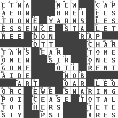ACROSS 1. Inactive volcano in Sicily 5. ___ Haven, CT 8. Head covering 11. A really long time 12. Cy Young winner Saberhagen 14. Raised railways 15. Marketplace scale 17. Tall tales 18. French article 19. Center 21. R.R. building 22. Allow 23. Born 24. Spanish title 25. Hit sharply and swiftly 27. Baseball player Mel 28. Burn to charcoal 31. Scottish caps 35. Ewer handle 37. Heavy book 38. Sign of things to come 39. Title for a knight 41. Washington bills 42. Went 43. Petroleum 45. Monthly bill 46. Helper 47. Disorderly crowd 49. Nonscientific branch of learning 51. Rowing implement 52. Lion 55. The grampus (Milton) 57. She-sheep 60. Catching in a trap 62. Luau course 63. Stop 65. "_____ Recall" 66. Small child 67. Possessive pronoun 68. Wig 69. Filthy place 70. Pacific Standard Time (abbr.) 71. Ancient Greek god of war DOWN 1. Consumed 2. Laconic 3. Trap for birds or small mammals 4. Singer Murray 5. Basketball assoc. 6. Blunders 7. Left 8. Portable communications device 9. Toward shelter 10. Inconspicuous attention getter 13. Russian ruler of old 16. Inside; within (prefix) 17. Gossips 20. ____ d'Azur (French Riviera) 26. Thespian 29. So be it 30. State of inaction 31. Ancient Roman robe 32. Mine, in Marseilles 33. Ananias' fault 34. Contemptuous expression 36. _ de Janeiro 40. Full of chinks, cracks, or crevices 44. Grant temporary use of 48. Naughty child 50. Technical work 52. 61 cubic inches 53. Maternal 54. Stares at amorously 55. Elects 56. Carrot, for example 58. Shed a tear 59. Hearing organs 61. Round or rotation of duties 64. Fast jet (abbr.)