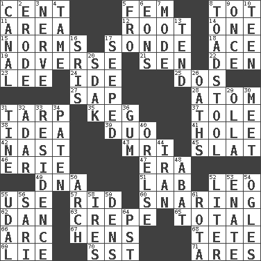 ACROSS 1. Penny 5. Opposite of masc. 8. Small child 11. Type of rug 12. Carrot, for example 14. Single 15. Typical standards 17. Something which is sent 18. Adept person 19. Contrary to your interests or welfare 21. Elected rep. 22. Lair 23. Area sheltered from the wind 24. Binary compound 25. Two (Sp.) 27. Plant excrement 28. Smallest unit of an element 31. Canvas cover 35. Cask 37. Lacquered or enameled metalware 38. The main thing one is thinking about 39. Superhero pair 41. Opening into or through something 42. Political cartoonist Thomas 43. Medical imaging device (abbr.) 45. Narrow board 46. One of the Great Lakes 47. Epoch 49. Heredity factor (abbr.) 51. Experiment locale 52. Lion 55. Purpose 57. To free from 60. Catching in a trap 62. One of the 12 tribes of Israel 63. Streamer paper 65. Add up to 66. Curve 67. Coop moms 68. False hair 69. Whopper 70. Fast jet (abbr.) 71. Ancient Greek god of war DOWN 1. Lessep's creation 2. Eat (away) 3. Boldness 4. Not wild 5. Back 6. Immeasurably long periods of time 7. Method 8. Inedible or poisonous agaric 9. At one time in the past 10. Adolescent 13. Be inclined (to) 16. Indian titles of respect 17. Oozed 20. Neighbor of Neb. 26. Profane or obscene expressions 29. Rounded earthenware pot or jar 30. Rendezvous 31. Prong on a fork 32. The sixth month of the Jewish calendar 33. Home 34. Eucharist need 36. Chewing product 40. Threatening words 44. SW Asia republic 48. Blind as ____ 50. Bowlike part 52. 61 cubic inches 53. Maternal 54. Stares 55. Hereditary estate 56. Indian skirt 58. Angers 59. Hiding places for outlaws 61. Round or rotation of duties 64. Pacific Standard Time (abbr.)