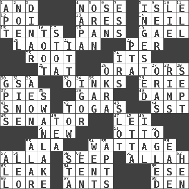 ACROSS 1. Added to 4. Olfactory organ 8. Small island 12. Luau course 13. Ancient Greek god of war 14. Famous astronaut Armstrong 15. Portable shelters 18. Zero-star reviews 19. Highlander 20. Of or relating to Laos or its people 22. For each 23. Carrot, for example 24. ___ a Wonderful Life 25. Make lace 26. Speakers 30. Girls' org. (abbr.) 33. Pig sounds 36. One of the Great Lakes 37. Sliced desserts 39. Slender fish 40. Moist 41. Frozen precipitation 42. Ancient Roman robes 44. Fast jet (abbr.) 45. Legislator 47. Luau accessory 50. ___ Haven, CT 51. Von Bismarck 53. Chicken ___ king 54. Electrical Measurement 57. Silent film actress Nazimova 59. Ooze 61. Assad's deity 63. Path through which fluid escapes 64. Portable shelter 65. Compass dir. 66. Old wives' tales, e.g. 67. Pismires 68. Lair DOWN 1. Fitting 2. Christmas carol 3. Middle Eastern gold or silver currency 4. California wine valley 5. NW Algerian seaport 6. Elected rep. 7. Curvy letter 8. Eaten 9. Singe 10. Untruth 11. Pipe bend 16. A blast of a horn 17. Portico 21. "Tell ____ the Marines!" 22. Parent Teacher Association (abbr.) 24. Big collection agency 26. Gumbo ingredient 27. Mouths or openings 28. Basketball hoops 29. Back-to-school mo. 30. Global Positioning Systems (abbr.) 31. Trig term 32. A really long time 34. Russian composer Stravinsky 35. Tired old horse 38. Tchaikovsky ballet 42. Pull behind 43. Position in a hierarchy or organization 46. Afternoon social gathering 48. Singer James 49. Slanted text style (abbr.) 52. Stared at amorously 53. Having or resembling wings 54. Left 55. Tenement units (abbr.) 56. Relaxation 57. 100% 58. Lion 59. R.R. building 60. Car or cant ending 62. Layer