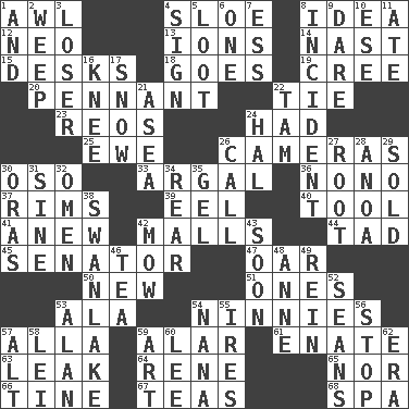 ACROSS 1. Leather borer 4. A type of plum 8. The main thing one is thinking about 12. Modern: prefix 13. Charged atoms 14. Political cartoonist Thomas 15. Writing tables 18. Moves 19. Algonquian 20. Pre-World Series prize 22. Make a knot 23. Vintage cars 24. Possessed 25. She-sheep 26. Devices for capturing images 30. Bear (Spanish) 33. Therefore, facetiously 36. Words to Nanette 37. Basketball hoops 39. Snakelike fish 40. Implement 41. Afresh 42. Shopping centers 44. Bit 45. Legislator 47. Rowing implement 50. ___ Haven, CT 51. Washington bills 53. In the manner of 54. Fools 57. Silent film actress Nazimova 59. Having or resembling wings 61. Maternal 63. Path through which fluid escapes 64. French philosopher Descartes 65. And not 66. Prong on a fork 67. Afternoon social gatherings 68. Health resort DOWN 1. Also 2. Shed a tear 3. Failure 4. Signal 5. Plunder 6. Single 7. Double-curved letter 8. Event 9. Have the gumption 10. Compass dir. 11. Had dinner 16. Leg joint 17. Frozen precipitation 21. At sea 22. Scottish cap 24. Actor Linden 26. Give a ring to 27. Carrot, for example 28. Small Philippine buffalo 29. Disposed of to a purchaser 30. Mouths or openings 31. Trig term 32. Sign of things to come 34. Located in or toward the back 35. Set 38. Tchaikovsky ballet 42. Cut the grass 43. Within a short period 46. Beverage made from leaves 48. Singer Murray 49. It's straight from the horse's mouth 52. Seines 53. Actor Alda or Thicke 54. Grandmother 55. Angers 56. Obstruct or block passage 57. The first octave above the treble staff 58. Flowery wreath 59. Tate display 60. Area sheltered from the wind 62. Period