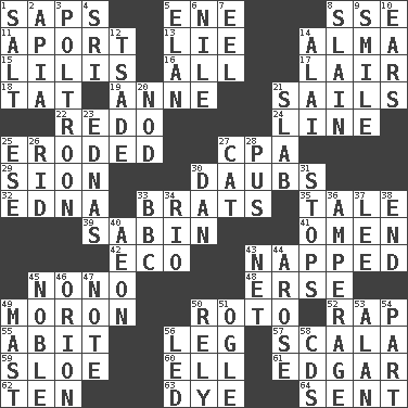 ACROSS 1. Plant excrements 5. Compass dir. 8. Compass dir. 11. To the left, to Queeg 13. Whopper 14. _ mater 15. Ms. Damita and namesakes 16. 100% 17. Den 18. Make lace 19. Singer Murray 21. Travels by water 22. Make new 24. Actor's bit 25. Eaten away 27. Tax preparer (abbr.) 29. The Jewish people; Israel 30. Applies to a surface 32. Pulitzer Prize-winning author Ferber 33. Naughty children 35. Falsehood 39. Unit of acoustic absorption 41. Sign of things to come 42. Environmental prefix 43. Slept 45. Words to Nanette 48. Celtic language 49. Person of subnormal intelligence 50. Printing process, for short 52. Strike 55. "This won't hurt ____!" 56. Part of a journey 57. Any of the three canals of the cochlea 59. _ gin 60. Pipe bend 61. _ Allan Poe 62. Nine, plus one 63. Color 64. Posted DOWN 1. Table seasoning 2. Capital of Western Samoa 3. Coward 4. _ Lanka 5. Flair 6. The longest river in the world 7. Snakelike fish 8. Killed 9. Grin 10. Hearing organs 12. Sadhe (variant) 14. Mountain range southwest of Kyrgyzstan 20. Dreamland 21. Thick slice 23. Ferber et al. 25. Compass dir. 26. To free from 27. Domesticated feline 28. Fluid product of inflammation 30. Daniel's nick name 31. Discontinues 33. English channel? 34. _ de Janeiro 36. Electrical Measurement 37. Area sheltered from the wind 38. Conclude 40. Period of immesurable duration 43. Fish or hair follower 44. Came up 45. Having high moral qualities 46. Greek mythologigal hunter 47. Observe 49. Vertical spar for supporting sails 50. Trust 51. Stare 53. Actor Alda or Thicke 54. Piece 56. Directed 58. Music discs