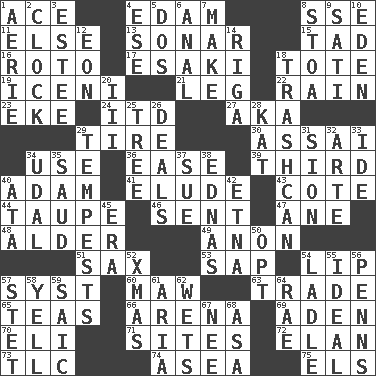 ACROSS 1. Adept person 4. Dutch treat 8. Compass dir. 11. Otherwise 13. Underwater navigation system 15. Small amount or degree 16. Printing process, for short 17. 1973 Nobel Price Winner (Physics) Leo 18. Carryall 19. Ancient Celtic tribe of eastern Britain 21. Part of a journey 22. Precipitation 23. Make supply last 24. It would 27. Alias (abbr.) 29. Hoop that covers a wheel 30. Slender Brazilian palm 34. Purpose 36. Comfort 39. One of three equal parts 40. First man 41. Dodge 43. ____ d'Azur (French Riviera) 44. Grayish beige 46. Transmitted 47. A saturated hydrocarbon 48. Tree or shrub in the Birch family 49. Soon (poet.) 51. Saxophone 53. Plant excrement 54. Mouth edge 57. System (abbr.) 60. Opening into something insatiable 63. Buy and sell 65. Afternoon social gatherings 66. Sports stadium 69. An important port of Yemen 70. Biblical high priest 71. Locates 72. Liveliness 73. Affectionate concern, for short 74. Toward the sea 75. Raised railways DOWN 1. Nest on high 2. Timepiece 3. First name in cosmetics 4. Compass dir. 5. Two (Sp.) 6. Of or related to the anus 7. Create 8. Portico 9. Suttee (variant) 10. Genesis locale 12. A really long time 14. Port city in Latvia 18. File 13 20. One more than two 25. Relationship diagram 26. Allots cards 28. Krazy ___ of comics 29. Storms 31. The Jewish people; Israel 32. Johnson of "Laugh-In" 33. Binary compound 34. Allodial 35. Saudi Arabian king (1953-1964) 37. Institute legal proceedings 38. Ferber et al. 40. "One Day ___ Time" 42. Inactive volcano in Sicily 45. Epoch 50. Choose 52. Dec. holiday 54. Dipping utensil 55. Standard of perfection 56. Actor Sean's family 57. Proofreading order 58. Shout 59. Ketch in the Levant 61. Operatic vocal solo 62. Soaks 64. Actress Charlotte 67. Born 68. White ___ sheet