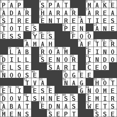 ACROSS 1. Infant food 4. Petty quarrel 8. Cause to be 12. The sixth month of the Jewish calendar 14. Ethiopian city, capital of Harari 16. Type of rug 17. Beget 18. Pleas 20. Lugs 22. Animal enclosure 23. A saturated hydrocarbon 24. Curvy letter 25. It is so 28. Egg _ yung 30. Nanny 31. Following 35. Experiment locale 37. Wander 40. Fine (Spanish) 41. Deli pickle 42. Sir (Sp.) 44. Southeast Asian peninsula 45. Otherwise 46. Indian skirt 47. Corporate head (abbr.) 48. Trap for birds or small mammals 50. Double curve, resembling the letter S 52. Federal power corp. 54. Tired old horse 55. Being at a high temperature 58. Biblical high priest 61. Compass dir. 63. Dwarf 65. Innocence, gentleness, or tenderness 70. Arab leader 71. Blind as ____ 72. Ferber et al. 73. Soaks 74. Not women's 75. Back-to-school mo. 76. Compass dir. DOWN 1. Thick mixture 2. Goodbye (Sp.) 3. Components 4. A female animal or person 5. Baking dish 6. Tate display 7. Canvas cover 8. Floor covering 9. Roberta Peters solo 10. Peachy ____! 11. Comfort 13. Portuguese money of account (variant) 15. Coral collection 19. Small Philippine buffalo 21. Symbol (abbr.) 26. Hearing organs 27. Imelda's hoard 29. Public position 30. Most capable 32. Prong on a fork 33. Inside; within (prefix) 34. Friend of Pooh 35. _ and Stitch 36. In addition 38. Santa ___, CA 39. Person of subnormal intelligence 41. Lair 43. Capital of Latvia 49. Nights before holidays 51. Ovum 53. American tennis player Robert 55. Dwellings 56. Leaves out 57. Laconic 58. Dutch treat 59. Ear part 60. _ the terrible 62. Conclusions 64. ___ Haven, CT 66. ___ a Wonderful Life 67. Compass dir. 68. Plant excrement 69. Fast jet (abbr.)