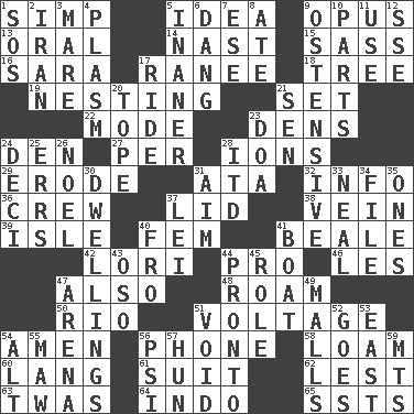 ACROSS 1. Simple or foolish person 5. The main thing one is thinking about 9. Musical composition 13. Taken by mouth 14. Political cartoonist Thomas 15. Backtalk 16. "Two Mules for Sister ____" 17. Indian princess (variant) 18. Family _ (genealogy) 19. Snuggling 21. Put into a specified state 22. Method 23. Habitations of wild animals 24. Lair 27. For each 28. Charged particles 29. Eat (away) 31. "One Day ___ Time" 32. Information 36. Group working together 37. Hat (slang) 38. Distinctive style or manner 39. Capri or Wight 40. Opposite of masc. 41. Memphis, Tenn. Street 42. Australian parrot (variant) 44. Adept person 46. French article 47. In addition 48. Wander aimlessly 50. _ de Janeiro 51. Electrical Measurement 54. So be it 56. Give a jingle 58. Rich soil 60. Austrian-born American filmmaker Fritz 61. Costume for a special activity 62. For fear that 63. It was, poetically 64. Southeast Asian peninsula 65. Fast planes DOWN 1. Mayday 2. SW Asia republic 3. Female horse 4. Suffix with ecto or cyto 5. Sillier 6. Mild oath, euphamism for damn 7. Compass dir. 8. Had dinner 9. Clearly or manifestly demonstrative 10. Pieces 11. Purpose 12. Compass dir. 17. Travel on an animal 20. Drink excessively 21. Elected rep. 23. ___ good deed 24. Tenth: prefix 25. Blunders 26. Christmas carol 28. It would 30. Residences 31. Direct toward a target or goal 33. Actress Patricia 34. Do some clerical work 35. Washington bills 37. Flowery wreath 40. From 41. Water vessel 43. Bear (Spanish) 44. Right away 45. Hero or heavy, e.g. 47. Sports stadium 49. Promenades 51. State of nonexistence 52. Moves 53. Compass direction 54. Keyboard modifier key 55. Informal term for the mouth 56. Air pressure measure (abbr.) 57. Attila the _ 59. Mountains (abbr.)