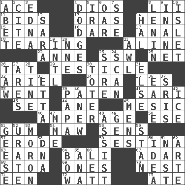 ACROSS 1. Adept person 4. "Vaya con ____" 8. Cards in a Roman deck? 11. Auction offers 13. Mouths or openings 14. Coop moms 15. Inactive volcano in Sicily 16. Have the gumption 17. Of or related to the anus 18. Rending 21. Place in a line 22. Singer Murray 23. Compass dir. 25. Remaining after all deductions 26. Make lace 29. A testis 32. Satellite of Uranus 34. Mouth or opening 35. French article 38. Left 39. Eucharist need 41. Indian skirt 43. Arrange properly for use 44. A saturated hydrocarbon 45. Of or pertaining to a meson 46. Electrical Measurement 50. Compass dir. 51. Chewing product 54. Informal term for the mouth 55. Elected reps. 57. Eat (away) 59. French poetic form 63. Merit 64. Indonesian resort city 67. The sixth month of the Jewish calendar 68. Portico 69. Washington bills 70. Egg locale 71. Car or cant ending 72. Electrical Unit 73. Had dinner DOWN 1. Collude with 2. Quote 3. Pulitzer Prize-winning author Ferber 4. Evades 5. Retirement account (abbr.) 6. Boat paddle 7. Compass dir. 8. Soviet premier 1918-24 9. Empty; void 10. Small island 12. "Two Mules for Sister ____" 14. Actor Linden 19. International (abbr.) 20. Compass dir. 21. Leather borer 23. Father 24. Glance over 26. The 23rd letter of the Hebrew alphabet 27. Ancient Greek god of war 28. Prong on a fork 30. Carrier 31. Otherwise 33. Singer James 36. Comfort 37. Indian titles of respect 39. Dad 40. Afresh 42. Frozen water 45. Not women's 47. Madame (abbr.) 48. Help 49. Turn to the right 51. Honkers 52. A salt of uric acid 53. Person of subnormal intelligence 56. Comedian Laurel of Laurel & Hardy 58. Heredity factor (abbr.) 60. It may be bright or harebrained 61. Political cartoonist Thomas 62. Johnson of "Laugh-In" 64. Ribbon knot 65. Santa ___, CA 66. Allow