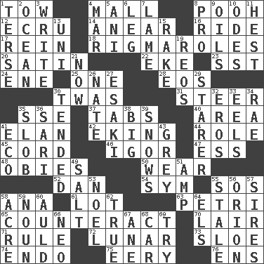 ACROSS 1. Pull behind 4. Shopping center 8. "Silly old bear" 12. Shade of tan 14. Approach 16. Travel on an animal 17. It's straight from the horse's mouth 18. Frustrating wastes of time 20. Smooth fabric 22. Make supply last 23. Fast jet (abbr.) 24. Compass dir. 25. Single 28. Greek goddess of the dawn 30. It was, poetically 31. Guide 35. Compass dir. 37. Bar bills 40. Type of rug 41. Enthusiasm 42. Supplementing with great effort 44. Hero or heavy, e.g. 45. Drawstring 46. Russian composer Stravinsky 47. Double-curved letter 48. Off-Broadway awards 50. Erode 52. Daniel's nick name 54. Symbol (abbr.) 55. Distress signal 58. Santa ___, CA 61. Car dealer's back yard 63. _ dish (used to culture cells) 65. Neutralize 70. Den 71. Governing power 72. Type of eclipse 73. _ gin 74. Inside; within (prefix) 75. Suggestive of the supernatural 76. Followers of ems DOWN 1. Laconic 2. Sea 3. Compose 4. Third mo. 5. Cuckoo 6. Part of a journey 7. Unable to walk 8. Adept person 9. Lubricates 10. Lyric poems 11. Command 13. Single; one (prefix) 15. Libertine 19. Vintage cars 21. Immediately 26. Nathan's nickname 27. 1973 Nobel Price Winner (Physics) Leo 29. A viewer who gazes fixedly 30. Watched over 32. Greek god of love 33. Snakelike fish 34. Actress Charlotte 35. Messy guy 36. Indian skirt 38. Large 39. Overwhelms 41. Environmental prefix 43. Jennifer or Joel 49. Table seasoning 51. Electrical Unit 53. Christmas carol 55. Having lost freshness 56. Constellation of myth 57. Begets 58. 43,560 square feet 59. Part of speech 60. Old (Scot.) 62. Loyal 64. Raised railways 66. Modern: prefix 67. A saturated hydrocarbon 68. Auto 69. Attempt to accomplish something