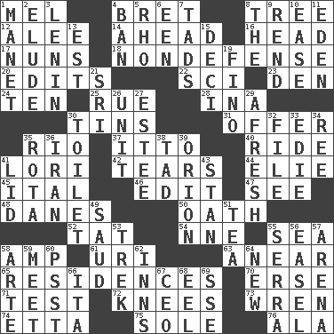 ACROSS 1. Cartoonist voice _ Blanc 4. Cy Young winner Saberhagen 8. Relationship diagram 12. Toward shelter 14. At or in the front 16. Froth on beer 17. Religious women 18. Unrelated to defense, as in spending 20. Prepares for publication 22. _-fi 23. Lair 24. Nine, plus one 25. Sorrow 28. _ tizzy (2 wds.) 30. Metal containers 31. Auction bid 35. River (Sp.) 37. "Tell ____ the Marines!" 40. Travel on or in a vehicle 41. Australian parrot (variant) 42. Rends 44. Writer Wiesel 45. Slanted text style (abbr.) 46. Prepare for publication 47. Observe 48. Natives or inhabitants of Denmark 50. Pledge 52. Make lace 54. Compass dir. 55. Ocean 58. Electrical Unit 61. RI univ. 63. Approach 65. Dwellings 70. Celtic language 71. Trial 72. Leg joints 73. Songbird 74. Singer James 75. Not divided or shared with others 76. According to DOWN 1. French painter Edouard 2. Dodge 3. Soviet premier 1918-24 4. Prohibit 5. 17th letter of the Greek alphabet 6. Car or cant ending 7. Small amounts or degrees 8. Definite Article 9. Tear apart 10. Comfort 11. Genesis locale 13. Eastern Standard Time (abbr.) 15. Tenth: prefix 19. A pale, very dry sherry 21. Indian title of respect (Mr.) 26. A single undivided whole 27. First name in cosmetics 29. Anew 30. Bathroom plumbing fixture 32. Do some clerical work 33. Singer Brickell 34. To separate or throw off 35. Roll call or roster of names 36. SW Asia republic 38. Small amount or degree 39. Greek mythologigal hunter 41. Hat (slang) 43. Comedian Laurel of Laurel & Hardy 49. Saudi Arabian king (1953-1964) 51. Beverage made from leaves 53. Long journey 55. Spanish missionary in California 56. Artist's stand 57. Sports stadium 58. Johnson of "Laugh-In" 59. Confront 60. Inconspicuous attention getter 62. Restaurants 64. ___ Haven, CT 66. Call ___ day 67. Corporate head (abbr.) 68. Snakelike fish 69. Compass dir.