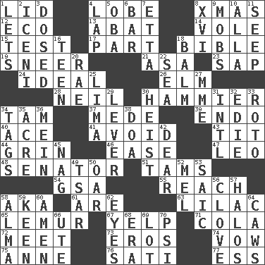 ACROSS 1. Flaplike covering 4. Ear part 8. Dec. holiday 12. Environmental prefix 13. Blind as ____ 14. Short-tailed, large-bodied rat 15. Trial 17. Piece 18. The Good Book 19. Contemptuous expression 21. White ___ sheet 23. Plant excrement 24. Standard of perfection 26. Shade tree 28. Famous astronaut Armstrong 30. More given to overacting 34. Scottish cap 37. Ancient Persian 39. Inside; within (prefix) 40. Adept person 41. Shun 43. Teat (slang) 44. Smile widely 46. Comfort 47. Lion 48. Legislator 51. Scottish caps 54. Girls' org. (abbr.) 55. Arrive at 58. Alias (abbr.) 61. "We ___ not amused" (Victoria) 63. Pale purple color 65. Arboreal primate 67. Sharp bark 71. Root beer relative 72. Confront 73. Greek god of love 74. Solemn pledge 75. Singer Murray 76. Suttee (variant) 77. Double-curved letter DOWN 1. Allows 2. Ancient Celtic tribe of eastern Britain 3. Administered medicine 4. Pet locale 5. Chief or king in Benin or Nigeria 6. Soap unit 7. Singer James 8. 16 9. Disorderly crowds 10. Silent film actress Nazimova 11. Ooze 16. Adolescent 18. Lip ointment 20. Actress Charlotte 22. Ocean 25. Pale green bean 27. Madame (abbr.) 29. Crowbar 30. Robbery 31. International (abbr.) 32. Singer Brickell 33. Printing process, for short 34. Labels 35. 1/640 square mile 36. Count _ (2 wds.) 38. ___ good deed 42. Letter starter 45. Tired old horse 49. Russian ruler of old 50. Rowing implement 52. Cartoonist voice _ Blanc 53. Ketch in the Levant 56. Garlic unit 57. Auras 58. _ mater 59. Peachy ____! 60. So be it 62. Sight organs 64. Crow sounds 66. Shoshoni 68. Epoch 69. Car dealer's back yard 70. Air pressure measure (abbr.)