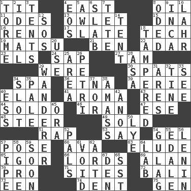 ACROSS 1. Teat (slang) 4. Compass direction 8. Petroleum 11. Lyric poems 13. A small or young owl 15. Heredity factor (abbr.) 16. Western Nevada city 17. Chalkboard 18. Technical work 19. Taiwanese island in East China Sea 21. Benjamin's nick name 22. The sixth month of the Jewish calendar 23. Raised railways 24. Plant excrement 27. Scottish cap 29. Past tense of be (plural) 30. Arguments over trivial matters 34. Health resort 36. Inactive volcano in Sicily 39. Nest on high 40. Enthusiasm 41. Odor 43. French philosopher Descartes 44. Twentieth part of a lira 46. SW Asia republic 47. Compass dir. 48. Guide 49. Disposed of to a purchaser 51. Strike 53. Declare 54. Set 57. Introduce or present, as a question 60. Actress Gardner 63. Evade 65. Russian composer Stravinsky 66. Titled peers of a realm 69. Actor Alda or Thicke 70. Adept person 71. Settings 72. Indonesian resort city 73. Car or cant ending 74. Undesirable depression on a surface 75. Commissioned military rank (abbr.) DOWN 1. Singer Mel 2. Perfect 3. Portable shelters 4. Greek goddess of the dawn 5. Leather borer 6. Thick slice 7. Wig 8. Wrote a lyric poem 9. South American Indian 10. Cowardly lion portrayer 12. Mayday 14. Portable shelter 18. ________ with (broke a safety seal) 20. Purpose 25. Type of rug 26. _ dish (used to culture cells) 28. White ___ sheet 29. Roamer 31. Ancient Greek god of war 32. Prong on a fork 33. Observe 34. Narrow, elongated depression 35. Diluted with white 37. And not 38. Collect or gather 40. Curvy letter 42. Small Philippine buffalo 45. Mouth or opening 50. Sodium hydroxide 52. Friends 54. POW camp 55. Peak District village in England 56. Soviet premier 1918-24 57. Corncob 58. Legendary monster 59. Within a short period 61. State of nonexistence 62. Johnson of "Laugh-In" 64. Experiment locale 67. Lair 68. Fast jet (abbr.)
