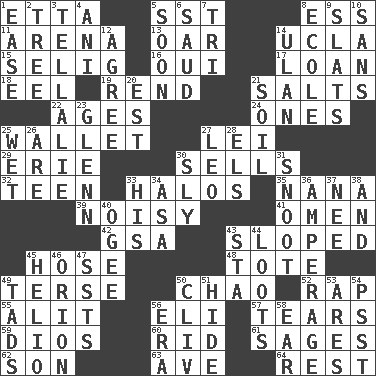 ACROSS 1. Singer James 5. Fast jet (abbr.) 8. Curvy letter 11. Sports stadium 13. Boat paddle 14. Southern CA. univ. 15. Former Milwaukee Brewers owner Bud 16. Fr. "Yes" 17. Grant temporary use of 18. Snakelike fish 19. Tear apart 21. Table seasonings 22. Eons 24. Singles 25. Place for singles 27. Luau accessory 29. 4th largest of the Great Lakes 30. Makes a sale 32. Adolescent 33. Auras 35. Grandmother 39. Annoyingly loud 41. Sign of things to come 42. Girls' org. (abbr.) 43. Inclined 45. Flexible conduit 48. Haul 49. Laconic 50. US Secretary of Labor Elaine L. _ 52. Hit sharply and swiftly 55. Set down 56. Biblical high priest 57. Rends 59. "Vaya con ____" 60. To free from 61. Gurus 62. Male child 63. "___ Maria" 64. Relief DOWN 1. Comfort 2. Relationship diagram 3. Copy Pinocchio 4. Cuckoo 5. Within a short period 6. Saudi Arabian king (1953-1964) 7. Three (prefix) 8. Learning spot: Fr. 9. Narrow boards 10. Without 12. Match 14. Uhlan (variant) 20. Eastern Standard Time (abbr.) 21. The visible part of the earth's surface 23. American astronaut and politician John 25. Soggy 26. "We ___ not amused" (Victoria) 27. Lion 28. Raised railways 30. Stealthy 31. Snob 33. Part of HMS, perhaps 34. White ___ sheet 36. Electrical Measurement 37. Born 38. Also 40. Double curve, resembling the letter S 43. R.R. building 44. Plunders 45. Sun: prefix 46. Constellation of myth 47. Fast planes 49. Bits 50. 154 in Roman numerals 51. Flintstone garb 53. Ancient Greek god of war 54. Inconspicuous attention getter 56. Epoch 58. Hearing organ