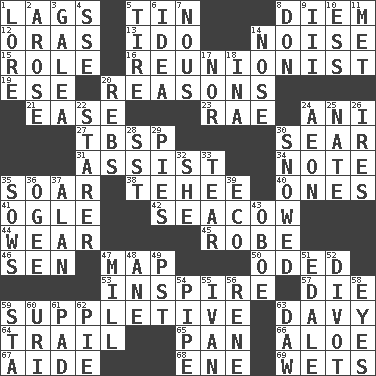 ACROSS 1. Falls behind 5. Metal container 8. South Vietnam president (1954) 12. Mouths or openings 13. Wedding promise 14. Annoying sound 15. Hero or heavy, e.g. 16. One who advocates reunion 19. Compass dir. 20. Thinks logically 21. Comfort 23. Actress Charlotte 24. Black tropical American cuckoo 27. Cook's measure (abbr.) 30. Burn superficially 31. Aid 34. Musical sound 35. Fly high 38. Giggle 40. Singles 41. Stare 42. Manatee 44. Erode 45. Loose flowing garment 46. Elected rep. 47. Atlas unit 50. Wrote a lyric poem 53. Motivate 57. Pass on 59. Supplementary 63. _ Jones' Locker 64. Go after with the intent to catch 65. Baking dish 66. Medicinal plant 67. Assistant 68. Compass dir. 69. Soaks DOWN 1. Old wives' tales, e.g. 2. Came up 3. An organ shaped like a helmet 4. Compass dir. 5. Hoop that covers a wheel 6. The content of cognition 7. Common sense 8. Spanish title 9. One more than two 10. Curvy letter 11. Was introduced to 14. Olfactory organ 17. And not 18. _ tizzy (2 wds.) 20. Confederate soldiers (slang) 22. A viewer who gazes fixedly 24. Period of immesurable duration 25. Nathan's nickname 26. Angers 28. Fast jet (abbr.) 29. Sliced desserts 30. Overwhelmed 32. A female animal or person 33. Pull apart 35. Sty mamas 36. Double curve, resembling the letter S 37. Actor Alda or Thicke 39. Environmental prefix 43. Mitch Miller's instrument 47. Place where flour is made 48. A saturated hydrocarbon 49. Pacific Standard Time (abbr.) 51. Peak District village in England 52. A piece of turf (Scot.) 54. Corncob 55. _ the terrible 56. French philosopher Descartes 58. Snake ____ (dice throw) 59. R.R. building 60. RI univ. 61. Writing tablet 62. Sliced dessert 63. Fool