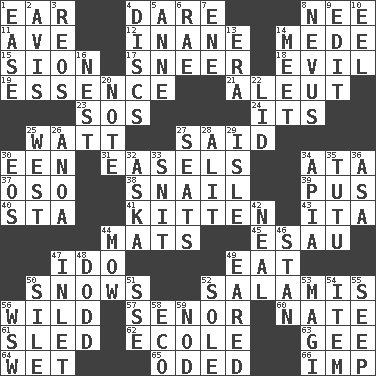 ACROSS 1. Ewer handle 4. Have the gumption 8. Born 11. "___ Maria" 12. Empty; void 14. Ancient Persian 15. The Jewish people; Israel 17. Scornful expression 18. Tending to cause great harm 19. Core 21. Native American of Southwest Alaska 23. Distress signal 24. ___ a Wonderful Life 25. Electrical Unit 27. Expressed in words 30. Car or cant ending 31. Artist's stands 34. _ moment's notice (2 wds.) 37. Bear (Spanish) 38. Slow-paced one 39. Product of festering 40. R.R. building 41. Baby cat 43. Call ___ day 44. Floor coverings 45. He sold his birthright 47. Wedding promise 49. Erode 50. Frozen precipitation (plural) 52. Deli grouping 56. Rampant 57. Sir (Sp.) 60. Nathan's nickname 61. Downhill vehicle 62. Learning spot: Fr. 63. Turn to the right 64. Soggy 65. Wrote a lyric poem 66. Mischievous child DOWN 1. Relaxation 2. Advice 3. Vintage cars 4. Plates 5. Queen of England 1702-14 6. Actress Charlotte 7. Compass dir. 8. Congenital growth or mark on the skin 9. Prepare for publication 10. Snakelike fish 13. Period 14. Rendezvous 16. A home for chicks 20. Musical sound 22. Hat (slang) 25. Compass direction 26. Small Philippine buffalo 27. Theater features 28. Came down and settled, as after flight 29. Capri or Wight 30. Greek goddess of the dawn 32. "____ silly question..." 33. In a ____ (agitated or irritated) 34. Capital of Western Samoa 35. Ballerina skirt 36. White ___ sheet 42. Actress Patricia 44. Cut the grass 46. Comedian Laurel of Laurel & Hardy 47. An arm off of a larger body of water 48. Texas town _ City 49. Having ears or earlike features 50. Drop; flow; fall 51. Compass dir. 52. Flatfish 53. Wise men 54. Detail 55. Ooze 56. Compass dir. 58. Environmental prefix 59. Dreamland