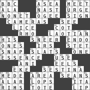 ACROSS 1. English channel? 4. Toward the sea 8. Rendezvous 12. Insect wing 13. Political cartoonist Thomas 14. Goad 15. Music written for nine 18. Double curve, resembling the letter S 19. Attach a signature 20. Devices for capturing images 22. Perceive with the eye 23. Louse (plural) 24. Small bed 25. 17th letter of the Greek alphabet 26. Of or relating to Laos or its people 30. Part of HMS, perhaps 33. Contemptuous expression 36. Inside; within (prefix) 37. Washington bills 39. Big collection agency 40. Proofreading order 41. Fastener 42. Narrow boards 44. Single 45. Core 47. Purpose 50. Cuckoo 51. Snakelike fish 53. Supplement with great effort 54. French poetic form 57. Ancient Persian 59. Length times width 61. Seines 63. Having or resembling wings 64. Chops off 65. Call ___ day 66. Basketball hoops 67. Carryall 68. Mouth edge DOWN 1. Bar 2. Alliance 3. Lessep's creation 4. Small Philippine buffalo 5. Sinks 6. Compass dir. 7. Had dinner 8. French bagpipes 9. 4th largest of the Great Lakes 10. Oval reproductive body of a fowl 11. "___ Little Indians" 16. Independent ruler or chieftain 17. Technology 21. Vintage cars 22. "Barney Miller" actor Jack 24. Auto 26. For fear that 27. To the inside or interior of 28. An important port of Yemen 29. Brief written record 30. Flexible conduit 31. Restaurants 32. Oceans 34. Mediterranean tributary 35. Period 38. Orators 42. _-fi 43. Takes to court 46. Compass dir. 48. Arranges properly for use 49. Writer Wiesel 52. Slow-paced one 53. Dutch treat 54. Back-to-school mo. 55. Comfort 56. Opposed to 57. Spoil 58. Biblical high priest 59. Keyboard modifier key 60. Friend of Pooh 62. Plant excrement