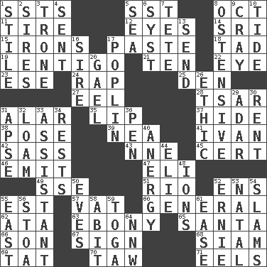 ACROSS 1. Fast planes 5. Fast jet (abbr.) 8. Sep. follower 11. Hoop that covers a wheel 12. Snake ____ (dice throw) 14. Indian title of respect (Mr.) 15. Removes the wrinkles 17. Thick mixture 18. Small boy 19. Small, flat, pigmented spot on the skin 21. Nine, plus one 22. Sight organ 23. Compass dir. 24. Reproach for some lapse or misdeed 25. Lair 27. Snakelike fish 28. Russian ruler of old 31. Having or resembling wings 35. Mouth edge 37. Flintstone garb 38. Airs 39. Teachers' org. 41. "Terrible" tsar 42. Backtalk 43. Compass dir. 45. Sure thing 46. Give off 47. Connecticut Ivy Leaguer 49. Compass dir. 51. _ de Janeiro 52. Followers of ems 55. Eastern Standard Time (abbr.) 57. Large container 60. Commissioned military rank 62. "One Day ___ Time" 63. Black 65. Before Barbara or Clara 66. Male offspring 67. Public display of a written message 68. Thailand, formerly 69. Make lace 70. The 23rd letter of the Hebrew alphabet 71. Snakelike fish DOWN 1. Vertical member of a panel or frame 2. Titles for men of rank and authority 3. Heavy duty weighing machine 4. Transmitted 5. Ocean 6. System (abbr.) 7. False hair 8. Clearly or manifestly demonstrative 9. Supercomputer manufacturer 10. Event that recurs at intervals 13. Transmit 16. Title for a man of rank and authority 17. Cotton for raincoats, e.g. 20. Highlander 26. Value system 29. The sixth month of the Jewish calendar 30. Monthly bill 31. Domed church section 32. Rich soil 33. Helper 34. Musical pauses 36. Animal enclosure 40. Disorder of the immune system 44. Writer Wiesel 48. Charged particles 50. Nights before holidays 52. Bert's buddy 53. Relating to or accompanying birth 54. Shuts with force 55. Compass direction 56. Portico 58. "This won't hurt ____!" 59. Ancient Roman robe 61. Comfort 64. Compass dir.