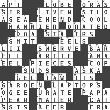 ACROSS 1. Fitting 4. Ear part 8. Mouths or openings 12. Title for a knight 13. Make or become more lively 14. Grain storage tower 15. At sea 17. Make improvements or corrections to 18. Calm and collected 19. More given to overacting 21. Declaimed 23. ___ good deed 24. R.R. building 26. Big collection agency 27. Stricken, poetically 28. Snakelike fish 30. Cards in a Roman deck? 31. Turn aside suddenly 34. Soap unit 37. Pipe bend 38. Nick name for Arthur 39. Santa ___, CA 40. Snakelike fish 41. Parts 42. Police officer (slang) 43. Beer foam 44. "____ silly question..." 46. Set 47. The 23rd letter of the Hebrew alphabet 50. It is 51. Place where plants grow 54. Portable computers 57. Double curve, resembling the letter S 58. A salt of uric acid 60. Dad 62. Lightbulb-shaped fruit 63. Mother 64. Feline 65. Fast planes 66. Fermented drink made from hops 67. Epoch DOWN 1. White ___ sheet 2. Expression of disdain 3. Excercise machine 4. Citrus fruits 5. Unconcealed 6. Benjamin's nick name 7. Inside; within (prefix) 8. Motion picture awards 9. Debaucheries 10. _ vera 11. Disposed of to a purchaser 13. Flowery wreath 16. Mine, in Marseilles 20. Floor covering 22. Cause heat under the collar 25. Nest on high 27. Drop; flow; fall 29. Nights before holidays 30. Area sheltered from the wind 31. Stated 32. Obtain by seizing forcibly or violently 33. And so on (abbr.) 34. Keyboard key 35. Small Philippine buffalo 36. Strike 41. Whimper 43. Spring feasts 44. Small island 45. Discontinue 46. Relatively large 48. Having winglike extensions 49. Wetness 51. Republicans 52. Eons 53. Unfeeling 55. For each 56. Practice fight 59. Actress Charlotte 61. _ moment's notice (2 wds.)