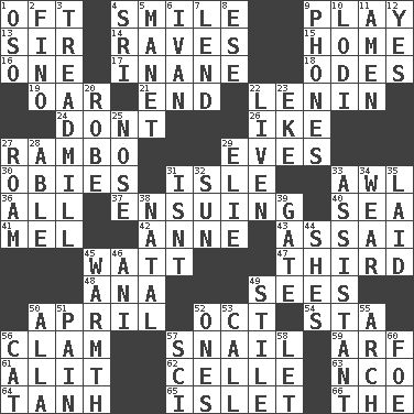 ACROSS 1. Often (poetically) 4. Grin 9. Live dramatic performance 13. Title for a knight 14. All-night dance parties 15. Residence 16. Single 17. Silly 18. Lyric poems 19. Boat paddle 21. Conclusion 22. Soviet premier 1918-24 24. Do not 26. Eisenhower's nickname 27. Role for Stallone 29. Nights before holidays 30. Off-Broadway awards 31. Capri or Wight 33. Leather borer 36. Everything 37. Following as a consequence or result 40. Ocean 41. Cartoonist voice _ Blanc 42. Queen of England 1702-14 43. Slender Brazilian palm 45. Electrical Unit 47. One of three equal parts 48. Santa ___, CA 49. Observes 50. Showery time 52. Sep. follower 54. R.R. building 56. Burrowing marine mollusk 57. Slow-paced one 59. Sandy's bark 61. Came down and settled, as after flight 62. Cell (Danish) 63. Non-commissioned officer (abbr.) 64. Hyperbolic tangent 65. Small island 66. Definite Article DOWN 1. Bear (Spanish) 2. Fine (Spanish) 3. Excercise machine 4. Indian title of respect (Mr.) 5. French painter Edouard 6. "Terrible" tsar 7. Grant temporary use of 8. Compass dir. 9. Gives a jingle 10. Farming town in central California 11. So be it 12. It is so 20. Loose flowing garment 22. Make or become more lively 23. Supplement with great effort 25. Olfactory organ 27. Wander aimlessly 28. Competent 29. Writer Wiesel 31. Is not 32. Player for Phoenix 33. Helper 34. Erode 35. Put down 38. Brizilian seaport 39. Yard entry 44. "______ My Girl" (Turtles hit) 45. Heat 46. Black tropical American cuckoo 49. Vertical member of a panel or frame 50. Silent film actress Nazimova 51. Ache 52. Washington bills 53. Give a ring to 55. Bowlike part 56. Domesticated feline 57. _-fi 58. Allow 60. Enemy