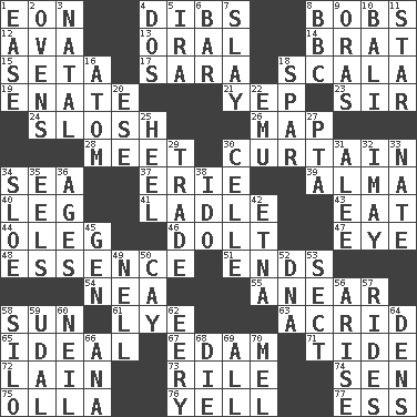 ACROSS 1. Period of immesurable duration 4. Rights 8. Moves up and down 12. Actress Gardner 13. Relating to the mouth 14. Naughty child 15. Stalk of a moss capsule 17. "Two Mules for Sister ____" 18. Any of the three canals of the cochlea 19. Related on the mother's side 21. Slangy assent 23. Title for a knight 24. Splash clumsily 26. Atlas unit 28. Rendezvous 30. Window treatment 34. Ocean 37. One of the Great Lakes 39. _ mater 40. Part of a journey 41. Dipping utensil 43. Erode 44. Cassini of fashion 46. Dunce 47. Sight organ 48. Core 51. Extremities 54. Teachers' org. 55. Approach 58. Player for Phoenix 61. Potassium hydroxide 63. Sour-tasting 65. Perfect 67. Dutch treat 71. Periodic rise and fall of the sea level 72. (Had) reclined 73. Cause heat under the collar 74. Elected rep. 75. Rounded earthenware pot or jar 76. Shout 77. Double-curved letter DOWN 1. Comfort 2. Baking chambers 3. Brizilian seaport 4. Two (Sp.) 5. Lyricist Gershwin 6. Drinking establishment 7. Kill 8. English channel? 9. Mouths or openings 10. Indonesian resort city 11. Play the lead 16. Tiny particle 18. Coast Guard woman 20. Compass dir. 22. Australian flightless bird 25. Person who is morally reprehensible 27. Parent Teacher Assoc. 29. Exchange 30. Cell (Danish) 31. Toward shelter 32. "If ____ say so..." 33. Nathan's nickname 34. _ gin 35. Snakelike fish 36. Eons 38. Wedding promise 42. Inactive volcano in Sicily 45. Commissioned mil. rank 49. 1994 drama film starring Jodie Foster 50. Island 52. Heredity factor (abbr.) 53. Religious group 56. Get up 57. Amusement-park features 58. Grain storage tower 59. Freehold land 60. Famous astronaut Armstrong 62. Suggestive of the supernatural 64. Hiding places for outlaws 66. Santa ___, CA 68. Expire 69. 100% 70. Cartoonist voice _ Blanc