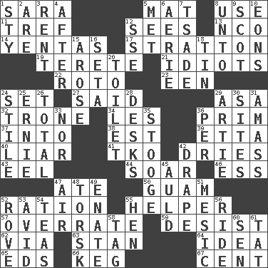 ACROSS 1. "Two Mules for Sister ____" 5. Floor protector 8. Purpose 11. Unclean, religiously 12. Perceives with the eye 13. Non-commissioned officer (abbr.) 14. Gossips 17. Ski resort town in Vermont 19. Cylindrical with tapered ends 21. Foolish or stupid persons 22. Printing process, for short 23. Car or cant ending 24. Arrange properly for use 27. Expressed in words 29. White ___ sheet 32. Marketplace scale 34. French article 36. Demure 37. To the inside or interior of 38. Eastern Standard Time (abbr.) 39. Singer James 40. One who doesn't tell the truth 41. Ring climax 42. Frees from moisture 43. Snakelike fish 44. Fly high 46. Double-curved letter 47. Had dinner 50. Island territory of the United States 52. Food allowance for one day 55. Aide 57. Make much ado about nothing 59. Cease 62. By way of 63. Comedian Laurel of Laurel & Hardy 64. It may be bright or harebrained 65. Begley and Asner 66. Cask 67. Penny DOWN 1. Filthy place 2. "We ___ not amused" (Victoria) 3. Monthly bill 4. Following 5. Was introduced to 6. Nest on high 7. Sadhe (variant) 8. To (old English) 9. Native of Scotland 10. Immeasurably long periods of time 12. Compass dir. 15. Came up 16. Bristle 18. Metal container 20. Bathroom plumbing fixture 24. Vertical member of a panel or frame 25. Bert's buddy 26. Add up to 28. Writing tables 29. Nick name for Arthur 30. Locates 31. Collect or gather 33. And not 35. Moe Howard, for one 36. For each 42. Window treatment 45. Old (Scot.) 47. Wind 48. Cod relative 49. Maternal 51. Of or pertaining to a meson 52. Be footloose 53. Enthusiastic 54. Afternoon social gatherings 55. Layer 56. Travel on or in a vehicle 58. Label 60. Elected rep. 61. Make lace