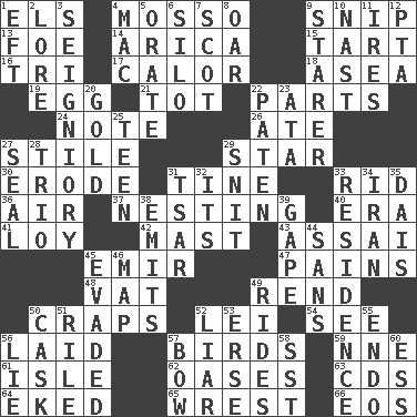 ACROSS 1. Raised railways 4. With motion or animation 9. Sever or remove by pinching or nipping 13. Enemy 14. N. Chile seaport 15. Small pie 16. Three (prefix) 17. Bodily heat indicating an inflammation 18. At sea 19. Oval reproductive body of a fowl 21. Small child 22. Pieces 24. Brief written record 26. Had dinner 27. Vertical member of a panel or frame 29. Play the lead 30. Eat (away) 31. Prong on a fork 33. To free from 36. Atmosphere 37. Snuggling 40. Period 41. Myrna of the movies 42. Vertical spar for supporting sails 43. Slender Brazilian palm 45. Independent ruler or chieftain 47. Aches 48. Large container 49. Tear apart 50. Dice game 52. Luau accessory 54. Observe 56. Put down 57. Avian creatures 59. Compass dir. 61. Capri or Wight 62. Fertile tracts in a desert 63. Music discs 64. Made supply last 65. Take or capture by force 66. Greek goddess of the dawn DOWN 1. Newt 2. Old wives' tales, e.g. 3. Signiory (variant) 4. Big _ 5. Declaim 6. Grain storage tower 7. Native of Scotland 8. Rowing implement 9. A viewer who gazes fixedly 10. Political cartoonist Thomas 11. Angers 12. Parent Teacher Assoc. 20. Precious metal 22. Eucharist need 23. _ moment's notice (2 wds.) 25. Adolescent 27. Lick closed 28. Musical group of three 29. In a ____ (agitated or irritated) 31. Russian ruler of old 32. ___ a Wonderful Life 33. Home 34. SW Asia republic 35. Raised platform 38. Sends forth 39. Open wide 44. Without 45. Eluded 46. Atlas unit 49. Amusement-park features 50. Keg 51. Cause heat under the collar 52. One who doesn't tell the truth 53. Celtic language 55. Inside; within (prefix) 56. Untruth 57. Ribbon knot 58. Fast jet (abbr.) 60. Double-curved letter