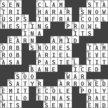 ACROSS 1. Elected rep. 4. Burrowing marine mollusk 8. R.R. building 11. Three (prefix) 12. Ethiopian city, capital of Harari 14. Overwhelm 15. United States Postal Service (abbr.) 17. Kind of red light 18. Calm and collected 19. Snuggling 21. Move like a hungry wolf 23. _ tizzy (2 wds.) 24. It is 25. Merit 27. Among 30. Globe 31. Sounds asleep 34. Scottish cap 37. Director Reiner 38. Satellite of Uranus 39. First lady 40. White ___ sheet 41. Soft color 43. Teat (slang) 44. Object of repulsion 45. On the rocks 47. "Barney Miller" actor Jack 49. Armed conflict 50. Letch 52. Moved like an arrow 56. Give off 57. Learning spot: Fr. 60. More than one (prefix) 61. _ and Stitch 62. Ferber et al. 63. Actress Charlotte 64. Mountains (abbr.) 65. Posted 66. Conclude DOWN 1. Astound 2. Celtic language 3. Pinches, bites 4. Large country 5. Long (Scottish) 6. Sandy's bark 7. Spoil 8. Overwhelms 9. Utensil 10. Leather borer 13. Hit sharply and swiftly 14. Native of Scotland 16. Move through with a circular motion 20. Taverns 22. To free from 25. Greek god of love 26. Swedish rock group 27. Ascend 28. Confront 29. Capri or Wight 30. Mouth or opening 32. California wine valley 33. Northwest Algerian city 34. Wig 35. Enthusiastic 36. Was introduced to 42. One who doesn't tell the truth 44. Male child 46. Riding implement 47. Moves on water 48. "Beetle Bailey" pooch 49. Obtain by seizing forcibly or violently 50. Stricken, poetically 51. To separate or throw off 52. Actor Alda or Thicke 53. Had on 54. Liveliness 55. Colored 56. Shade tree 58. Music discs 59. Single