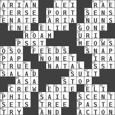 ACROSS 1. Believer in; advocate of (suffix) 6. Flowery wreath 9. Actress Charlotte 12. Laconic 13. Left side of a ship or aircraft 14. Elected reps. 15. Maternal 16. Operatic vocal solo 17. Religious women 18. Compass dir. 19. Writer Wiesel 20. Went 21. Wander 23. RI univ. 24. Inconspicuous attention getter 25. Catcalls? 28. Bear (Spanish) 30. Eats 34. Fastener 35. Infant food 36. Music written for nine 38. Lyricist Gershwin 39. Loyal 41. Brizilian seaport 43. Fast jet (abbr.) 44. Vegetable dish 46. Set of matching outer garments 48. White ___ sheet 49. Halt 50. Ship's personnel 51. Singer Brickell 53. Connecticut Ivy Leaguer 56. Silvers or Donahue 57. Move on water 58. Odor 60. Arranges properly for use 61. Family _ (genealogy) 62. Thick mixture 63. Attempt to accomplish something 64. Plus 65. NE Massachussets city DOWN 1. Had dinner 2. French philosopher Descartes 3. SW Asia republic 4. Michaelmas daisies 5. Born 6. Australian parrot (variant) 7. One of the Great Lakes 8. Call ___ day 9. One who advocates reunion 10. Singer Murray 11. Double-curved letter 13. Inside of hand 14. Sounds asleep 19. Consumed 20. Chewing product 22. Order of Saint Francis (abbr.) 24. Teen's desire 26. Armed conflicts 27. Argument over a trivial matter 28. Chooses 29. "Two Mules for Sister ____" 31. A really long time 32. Heredity factor (abbr.) 33. Arrange properly for use 37. Clothes sense 40. Artist's stands 42. Nilotic language 45. Obsolete 47. Medicinal drug used to evoke vomiting 49. Drop; flow; fall 50. "Mermaids" star 51. Merit 52. Passed on 54. For fear that 55. To the inside or interior of 56. Pacific Standard Time (abbr.) 57. R.R. building 58. Health resort 59. Nine, plus one