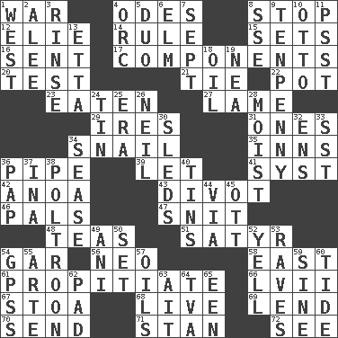 ACROSS 1. Armed conflict 4. Lyric poems 8. Cease 12. Writer Wiesel 14. Court order 15. Arranges properly for use 16. Transmitted 17. Parts 20. Trial 21. Neckwear 22. Plant holder 23. Ingested 27. Unable to walk 29. Angers 31. Washington bills 34. Slow-paced one 35. Lodging establishments 36. Corncob 39. Allow 41. System (abbr.) 42. Small Philippine buffalo 43. A piece of turf (Scot.) 46. Friends 47. In a ____ (agitated or irritated) 48. Beverages made from leaves 51. Letch 54. Slender fish 56. Modern: prefix 58. 90 degrees 61. Conciliate 66. 57 in ancient Rome 67. Portico 68. Moving, as bait 69. Grant temporary use of 70. Post 71. Comedian Laurel of Laurel & Hardy 72. Observe DOWN 1. 270 degrees 2. Toward shelter 3. Remove soap 4. The grampus (Milton) 5. Superhero pair 6. Shade tree 7. Back-to-school mo. 8. Compass dir. 9. 3-inch nail 10. Von Bismarck 11. Inconspicuous attention getter 13. Singer James 18. Lubricate 19. Teachers' org. 24. Metal container 25. Period 26. Famous astronaut Armstrong 28. Damp 30. Bobsleighs 32. Followers of ems 33. Fast jet (abbr.) 34. Gospel singer Marvin 36. Infant food 37. _ tizzy (2 wds.) 38. Coward 40. Canisters 44. By way of 45. Baseball player Mel 49. Black tropical American cuckoo 50. Arrange properly for use 52. Shout 53. All-night dance parties 54. Global Positioning Systems (abbr.) 55. Johnson of "Laugh-In" 57. Petroleums 59. Trig term 60. Event that recurs at intervals 62. Writing tablet 63. Small island 64. Federal power corp. 65. Car or cant ending