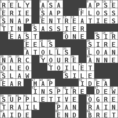 ACROSS 1. Depend 5. White ___ sheet 8. Domed church section 12. 4th largest of the Great Lakes 13. Plant excrement 14. Soft thread for cleaning between teeth 15. Fastener 16. Pleas 19. Shallow baking pan 20. More lively and spirited 21. Compass direction 23. Single 24. Title for a knight 27. Snakelike fish 30. Father 31. Ringlike coral islands and reefs 34. Grant temporary use of 35. Drug cop 38. You are 40. Singer Murray 41. Margarine 42. Rest room 44. Cole _ (cabbage dish) 45. Filth; sediment 46. Ewer handle 47. Atlas unit 50. The content of cognition 53. Heighten or intensify 57. Morning condensation 59. Supplying deficiencies 63. Legendary monster 64. Lag or linger behind 65. Baking dish 66. Water falling in drops from the sky 67. Assistant 68. Conclude 69. Cy Young winner Saberhagen DOWN 1. Take ten 2. Bert's buddy 3. Woody, climbing, usually tropical plant 4. Slangy assent 5. Toward the sea 6. Without 7. Tenement units (abbr.) 8. The first octave above the treble staff 9. Luau course 10. Compass dir. 11. Curvy letter 14. Conductor's collection 17. River (Sp.) 18. Car or cant ending 20. Proofreading order 22. Manatee 24. The Jewish people; Israel 25. SW Asia republic 26. French philosopher Descartes 28. Myrna of the movies 29. Narrow opening 30. Scheduled 32. Nilotic language 33. Indian titles of respect 35. Sense of smell 36. Silent film actress Nazimova 37. Located in or toward the back 39. Biblical high priest 43. Writer Wiesel 47. Place where flour is made 48. A saturated hydrocarbon 49. Pacific Standard Time (abbr.) 51. _ Allan Poe 52. Nest on high 54. Corncob 55. "Terrible" tsar 56. Tear apart 58. Gone 59. R.R. building 60. RI univ. 61. Groovy apt. 62. Sliced dessert 63. Globe