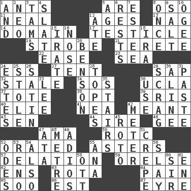 ACROSS 1. Pismires 5. "We ___ not amused" (Victoria) 8. Bear (Spanish) 11. Be tempered by heat 12. Ripens 13. Tired old horse 14. Realm 17. A testis 19. Disco prop 21. Cylindrical with tapered ends 22. Comfort 23. Ocean 24. Curvy letter 27. Portable shelter 29. Plant excrement 32. Lacking originality or spontaneity 34. Distress signal 36. Southern CA. univ. 37. Haul 38. Elect 39. Indian titles of respect 40. Writer Wiesel 41. Teachers' org. 42. Intended 43. Elected rep. 44. Beget 46. Unit of force equal to gravity 47. Nursemaid (var.) 50. College mil. group 52. Declaimed 55. Michaelmas daisies 57. Conveyance 59. Threatening words 62. Followers of ems 63. Round or rotation of duties 64. Ache 65. "Barney Miller" actor Jack 66. Eastern Standard Time (abbr.) 67. Jane of fiction DOWN 1. Plus 2. Modern: prefix 3. Scottish caps 4. Schedule 5. Ripen 6. Musical pauses 7. First name in cosmetics 8. Single time 9. Table seasoning 10. Double curve, resembling the letter S 12. Had dinner 15. Feeling or showing extreme anger 16. Sense of smell 18. Lyricist Gershwin 20. Gillaume's butler role 24. _____ Park, CO 25. Fur scarf 26. Smooth fabric 28. Drinks excessively 29. Strangle with an iron collar 30. Place in a line 31. Thick mixture 33. Area sheltered from the wind 35. Flight of steps 36. Purpose 42. Distance measurement 45. Printing process, for short 47. _ moment's notice (2 wds.) 48. Distance measurement (Brit.) 49. Goodbye (Sp.) 51. Streamer paper 52. Lyric poems 53. Former U.S. Attorney General Janet 54. In addition 55. Santa ___, CA 56. Kill 58. Baseball player Mel 60. Title for a knight 61. Compass dir.