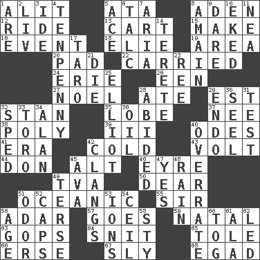ACROSS 1. Came down and settled, as after flight 5. "One Day ___ Time" 8. Arabian gulf 12. Travel on an animal 13. Heavy open wagon 15. Create 16. Incident 18. Writer Wiesel 19. Length times width 20. Groovy apt. 22. Borne 24. One of the Great Lakes 26. Car or cant ending 27. Christmas carol 28. Had dinner 29. Eastern Standard Time (abbr.) 32. Comedian Laurel of Laurel & Hardy 35. Ear part 37. Born 38. Much (prefix) 39. One more than two 40. Lyric poems 41. Period 42. Lacking warmth 43. Electrical Unit 44. Spanish title 45. The first octave above the treble staff 46. Jane of fiction 49. Federal power corp. 50. Letter starter 51. Pertaining to the sea 55. Title for a knight 56. The sixth month of the Jewish calendar 57. Leaves 59. Brizilian seaport 63. Republicans 64. In a ____ (agitated or irritated) 65. Lacquered or enameled metalware 66. Celtic language 67. Wily 68. Mild oath DOWN 1. "We ___ not amused" (Victoria) 2. 54 in ancient Rome 3. Binary compound 4. 3-inch nail 5. Adept person 6. Baby powder 7. Operatic vocal solo 8. With great haste 9. Have the gumption 10. Supplemented with great effort 11. Teachers' org. 14. Cigar-shaped 17. Edible starchy tuberous root 21. Expire 23. Portuguese money of account (variant) 25. American author Paul (1891-1958) 28. Tolerated 29. Inside; within (prefix) 30. Stitch closed the eyes of (a falcon) 31. Trial 32. Hurried 33. "Corrida" creature 34. Actor Alda or Thicke 36. Lubricate 40. Make much ado about nothing 42. Rings like a ship's bell 45. Actress Gardner 47. Affirmative reply 48. Precipitation 49. Laconic 51. Scent 52. Smile enhancers 53. Charged particles 54. To provide with a ceiling 56. Personal question 58. Filthy place 60. Coat; cloak 61. Insect wing 62. Directed