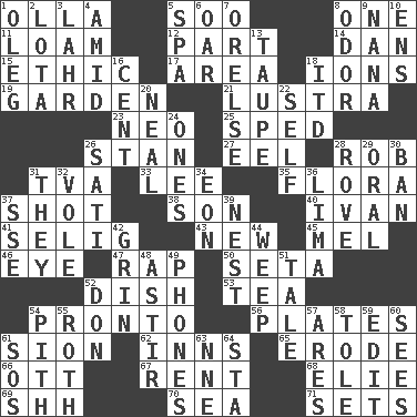 ACROSS 1. Water jar 5. "Barney Miller" actor Jack 8. Single 11. Rich soil 12. Piece 14. Daniel's nick name 15. Value system 17. Type of rug 18. Charged atoms 19. Place where plants grow 21. A period of five years 23. Modern: prefix 25. Broke a traffic law 26. Comedian Laurel of Laurel & Hardy 27. Snakelike fish 28. Director Reiner 31. Federal power corp. 33. Area sheltered from the wind 35. Plants 37. Attempt 38. Manchild 40. _ the terrible 41. Former Milwaukee Brewers owner Bud 43. ___ Haven, CT 45. Cartoonist voice _ Blanc 46. Sight organ 47. Strike 50. Bristle 52. Food container 53. Beverage made from leaves 54. Right away 56. Food holders 61. The Jewish people; Israel 62. Restaurants 65. Wear away 66. Baseball player Mel 67. Monthly bill 68. Writer Wiesel 69. Quiet! 70. Ocean 71. Puts into a specified state DOWN 1. Cassini of fashion 2. Globular water bottle used in Asia 3. Cowardly lion portrayer 4. Among 5. Health resort 6. Rowing implement 7. Threatening words 8. Scent 9. Grandmother 10. Followers of ems 13. Grayish beige 16. Penny 18. It would 20. Anneal 22. Automatically 24. Washington bills 26. Suttee (variant) 28. Be footloose 29. Spoken 30. Prohibit 31. Those things 32. Short-tailed, large-bodied rat 34. A really long time 36. Pale green bean 37. Compass dir. 39. A home for chicks 42. Smile widely 44. Shed a tear 48. Moving or stirring 49. Gives a jingle 51. Lie 52. Spanish title 54. Essential or central part 55. Writer of Portnoy's Complaint (1969) 57. Ancient Greek god of war 58. Lacquered or enameled metalware 59. Prepare for publication 60. Observes 61. Mayday 63. Compass dir. 64. R.R. building