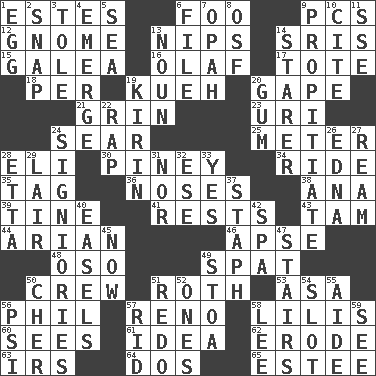 ACROSS 1. _____ Park, CO 6. Egg _ yung 9. Personal Computers (abbr.) 12. Dwarf 13. Cuts off 14. Indian titles of respect 15. An organ shaped like a helmet 16. Norwegian king 17. Carry 18. For each 19. Malaysian steamed pastry 20. Open wide 21. Smile widely 23. RI univ. 24. Scorch 25. Distance measurement 28. Biblical high priest 30. Abounding in pines 34. Travel on an animal 35. Label 36. Olfactory organs 38. Santa ___, CA 39. Prong on a fork 41. Musical pauses 43. Scottish cap 44. Believer in; advocate of (suffix) 46. Domed church section 48. Bear (Spanish) 49. Petty quarrel 50. Ship's personnel 51. Writer of Portnoy's Complaint (1969) 53. White ___ sheet 56. Silvers or Donahue 57. Western Nevada city 58. Ms. Damita and namesakes 60. Observes 61. The content of cognition 62. Wear away 63. Big collection agency 64. Two (Sp.) 65. First name in cosmetics DOWN 1. Ovum 2. Fastener 3. Lacquered or enameled metalware 4. Develop 5. Ocean 6. Do some clerical work 7. Brightly colored fish 8. Order of Saint Francis (abbr.) 9. Appease 10. Quote 11. Compass dir. 13. Part of speech 14. A viewer who gazes fixedly 19. Japanese brewing company 20. Chewing product 22. Reproach for some lapse or misdeed 24. Seigniories (variant) 26. Pulitzer Prize-winning author Ferber 27. 480, 500 or 516 sheets of paper 28. Singer James 29. Den 31. And not 32. Compass dir. 33. Consenting reply 37. Staphylococcus 40. Artist's stands 42. Health resort 45. At this time 47. Flight of steps 49. Portico 50. "Mermaids" star 51. Make new 52. Washington bills 54. Groove 55. Assistant 56. 23rd letter of the Greek alphabet 57. To free from 58. Area sheltered from the wind 59. Perceive with the eye