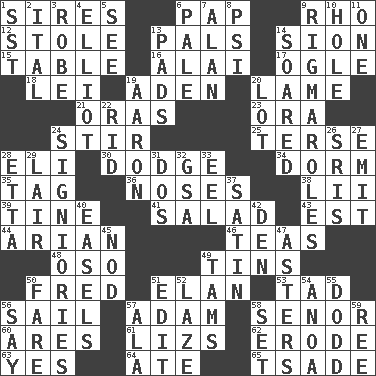 ACROSS 1. Male parents of animals 6. Infant food 9. 17th letter of the Greek alphabet 12. Took without asking 13. Friends 14. The Jewish people; Israel 15. Eating place 16. Mountain range southwest of Kyrgyzstan 17. Stare at amorously 18. Luau accessory 19. An important port of Yemen 20. Unable to walk 21. Mouths or openings 23. Mouth or opening 24. Agitate 25. Laconic 28. Connecticut Ivy Leaguer 30. Evade 34. Dormintory (informal) 35. Label 36. Olfactory organs 38. Cards in a Roman deck? 39. Prong on a fork 41. First course 43. Eastern Standard Time (abbr.) 44. Believer in; advocate of (suffix) 46. Afternoon social gatherings 48. Bear (Spanish) 49. Canisters 50. Flintstone 51. Liveliness 53. Small boy 56. Move on water 57. First of billions? 58. Sir (Sp.) 60. Ancient Greek god of war 61. Belonging to Elizabeth 62. Wear away 63. Consenting reply 64. Had dinner 65. Sadhe (variant) DOWN 1. Fast jet (abbr.) 2. Slanted text style (abbr.) 3. Loose flowing garment 4. American author Paul (1891-1958) 5. Perceive with the eye 6. Light colored 7. Actor Alda or Thicke 8. 23rd letter of the Greek alphabet 9. Frustrating wastes of time 10. Hollow 11. Single 13. Groovy apts. 14. Flew 19. Composer Copland 20. Car dealer's back yard 22. To free from 24. Seigniories (variant) 26. Indian titles of respect 27. Give off 28. Singer James 29. Den 31. Two (Sp.) 32. Girls' org. (abbr.) 33. Snakelike fish 37. Smooth fabric 40. Artist's stands 42. Lair 45. Dreamland 47. Michaelmas daisies 49. Scottish caps 50. Conductor's collection 51. Prepare for publication 52. Goldbrick 54. Small Philippine buffalo 55. Texas town _ City 56. Declare 57. According to 58. Put into a specified state 59. To sift