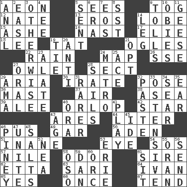 ACROSS 1. Period of immesurable duration 5. Observes 9. Coat; cloak 12. Nathan's nickname 13. Greek god of love 14. Ear part 15. American tennis player Robert 16. Political cartoonist Thomas 17. Writer Wiesel 18. Area sheltered from the wind 19. Make lace 21. Stares at amorously 22. Precipitation 24. Atlas unit 26. Compass dir. 27. A small or young owl 28. Religious group 29. Operatic vocal solo 30. Feeling or showing extreme anger 32. Introduce or present, as a question 36. Vertical spar for supporting sails 37. Wind 38. Toward the sea 39. Toward shelter 40. Fourth or lowest deck 42. Play the lead 43. Ancient Greek god of war 44. 61 cubic inches 46. Product of festering 49. Slender fish 50. An important port of Yemen 51. Silly 53. Sight organ 54. Mayday 57. The longest river in the world 58. Aroma 61. Father 62. Singer James 63. Indian skirt 64. "Terrible" tsar 65. Affirmative reply 66. At one time in the past 67. Watch over DOWN 1. Of or related to the anus 2. Comfort 3. Else 4. Born 5. Emitted 6. Period 7. Greek goddess of the dawn 8. Fast jet (abbr.) 9. For Whom the Bell _____ 10. Off-Broadway awards 11. Honkers 14. Part of a journey 19. Standoff 20. Against 21. Elect 23. Having winglike extensions 24. Paris' subway 25. Adept person 27. Spoken 28. Moves on water 29. Nanny (var.) 31. More uncommon 32. Thick mixture 33. Clearly or manifestly demonstrative 34. Dry up 35. Hearing organ 40. Mouth or opening 41. Live dramatic performance 43. Personal question 45. Binary compound 46. Abounding in pines 47. Join together 48. Table seasonings 52. Teachers' org. 53. 4th largest of the Great Lakes 55. NW Algerian seaport 56. Transmit 58. Bear (Spanish) 59. Daniel's nick name 60. The grampus (Milton) 61. Be seated