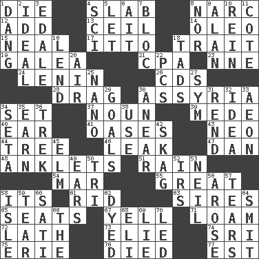 ACROSS 1. Pass on 4. Broad, flat, thick piece 8. Drug cop 12. Increase 13. To provide with a ceiling 14. Margarine 15. Actress Patricia 17. "Tell ____ the Marines!" 18. Distinguishing feature 19. An organ shaped like a helmet 21. Accounting whiz (abbr.) 23. Compass dir. 24. Soviet premier 1918-24 26. Music discs 28. To be drawn or hauled along 30. Nineveh was its capital 34. Put into a specified state 37. Part of speech 39. Ancient Persian 40. Hearing organ 41. Fertile tracts in a desert 43. Modern: prefix 44. Woody plant 46. Path through which fluid escapes 47. One of the 12 tribes of Israel 48. Short socks 51. Water falling in drops from the sky 54. Impair 55. Relatively large 58. It is 61. To free from 63. Titles for men of rank and authority 65. Theater features 67. Shout 71. Rich soil 72. Thin strip of wood or metal 73. Writer Wiesel 74. Indian title of respect (Mr.) 75. 4th largest of the Great Lakes 76. Passed on 77. Eastern Standard Time (abbr.) DOWN 1. Mild oath, euphamism for damn 2. Standard of perfection 3. Peak District village in England 4. _-fi 5. Allow 6. Small island 7. Coalition 8. Not either 9. Actor Alda or Thicke 10. It's straight from the horse's mouth 11. ____ d'Azur (French Riviera) 16. Grant temporary use of 18. Bits 20. Wind 22. Personal Computers (abbr.) 25. Billionth: prefix 27. Symbol (abbr.) 29. Purposes of endeavors 30. Approach 31. Tear apart 32. The main thing one is thinking about 33. Period of immesurable duration 34. Stalk of a moss capsule 35. Merit 36. Long journey 38. Purpose 42. Heroin 45. Shade tree 49. Hearing organs 50. Three (prefix) 52. Big collection agency 53. Famous astronaut Armstrong 56. Came up 57. Rends 58. Small island 59. Pull apart 60. Suttee (variant) 62. Colored 64. Stricken, poetically 66. Definite Article 68. Connecticut Ivy Leaguer 69. Whopper 70. Directed