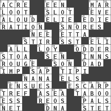 ACROSS 1. 43,560 square feet 5. Car or cant ending 8. Spoil 11. Plunder 12. Groove 14. Night before a holiday 15. Verbally 17. Writer Wiesel 18. Singer Brickell 19. Food allowance for one day 21. Sounds asleep 23. Born 25. Singer James 26. Use a spoon 27. Fast jet (abbr.) 28. Biblical high priest 31. 100% 33. Myrna of the movies 35. More peculiar 37. Portico 38. Elected rep. 40. Lodging establishments 41. Makeup applied to the cheeks 43. Manchild 45. June honoree 46. Mischievous child 47. Plant excrement 50. Native american tent (variation) 52. Grandmother 53. Raised railways 54. Follows as a consequence or result 56. Fortification 61. Not kosher 62. At sea 65. Off limits 66. Double-curved letter 67. Vintage cars 68. Friends 69. Remaining after all deductions 70. Heredity factor (abbr.) 71. Proofreading order DOWN 1. Having or resembling wings 2. Root beer relative 3. Carrot, for example 4. Needle holder 5. Compass dir. 6. Pipe bend 7. Annoying sounds 8. Ancient Persian 9. Opinion 10. To separate or throw off 13. Portable shelters 16. Do not 18. Epoch 20. Famous astronaut Armstrong 22. "Beetle Bailey" pooch 24. Greek god of love 26. Volcanic refuse 28. Pulitzer Prize-winning author Ferber 29. Grant temporary use of 30. Big collection agency 31. Tiny particle 32. Central Nebraska county 34. Consenting reply 36. "You Light Up My Life" star Conn 37. Indian title of respect (Mr.) 39. Make mention of 42. Son of Isaac 44. Mediterranean tributary 48. Approach 49. Went by 51. Inconspicuous attention getter 52. Overdraft (abbr.) 54. Celtic language 55. Egg locale 57. Smile enhancers 58. Blind as ____ 59. Hero or heavy, e.g. 60. Mail 61. Nine, plus one 63. Period of immesurable duration 64. White ___ sheet