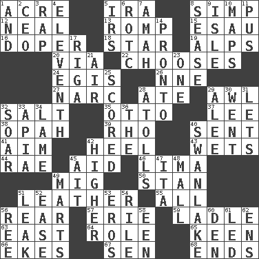 ACROSS 1. Land measure 5. Lyricist Gershwin 8. Simple or foolish person 12. Be tempered by heat 13. Frolic 15. He sold his birthright 16. Drug addict 18. Play the lead 19. High mountains 20. By way of 22. Elects 24. The front part of a cuirass 26. Compass dir. 27. Drug cop 28. Had dinner 29. Leather borer 32. Table seasoning 35. "Beetle Bailey" pooch 37. Area sheltered from the wind 38. Brightly colored fish 39. 17th letter of the Greek alphabet 40. Posted 41. Direct toward a target or goal 42. Person who is morally reprehensible 43. Moistens 44. Actress Charlotte 45. Help 46. Pale green bean 49. Russian fighter aircraft 50. Comedian Laurel of Laurel & Hardy 51. Cordwainer's material 55. 100% 56. Hitchcock's "____ Window" 57. One of the Great Lakes 59. Dipping utensil 63. 90 degrees 64. Hero or heavy, e.g. 65. Peachy ____! 66. Supplements with great effort 67. Elected rep. 68. Extremities DOWN 1. Also 2. Corporate head (abbr.) 3. Reproach for some lapse or misdeed 4. Veterans Day date 5. Big collection agency 6. College mil. group 7. Housemaid 8. Gospel singer Marvin 9. Capri or Wight 10. Atlas contents 11. Product of festering 14. Right away 17. Port city in Latvia 21. Atmosphere 23. Single 25. Tallied 28. Ringlike coral islands and reefs 29. Toward shelter 30. Left 31. Allows 32. Fly high 33. Capital of Western Samoa 34. Unable to walk 36. Definite Article 40. Tchaikovsky ballet 42. Having greater elevation 45. Small island 47. Call ___ day 48. Promenade 49. Shops 51. Path through which fluid escapes 52. Comfort 53. Greek god of love 54. Cause heat under the collar 56. To riddle 58. Car or cant ending 60. Lair 61. Directed 62. Followers of ems