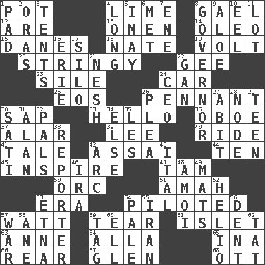 ACROSS 1. Plant holder 4. Citrus frut 8. Highlander 12. "We ___ not amused" (Victoria) 13. Sign of things to come 14. Margarine 15. Natives or inhabitants of Denmark 18. Nathan's nickname 19. Electrical Unit 20. Slender, wiry 22. Unit of force equal to gravity 23. Drop; flow; fall 24. Auto 25. Greek goddess of the dawn 26. Pre-World Series prize 30. Plant excrement 33. Phone greeting 36. Mitch Miller's instrument 37. Having or resembling wings 39. Area sheltered from the wind 40. Travel on or in a vehicle 41. Story 42. Slender Brazilian palm 44. "___ Little Indians" 45. Stimulate to action 47. Scottish cap 50. The grampus (Milton) 51. Nanny 53. Epoch 54. Manned the helm 57. Electrical Unit 59. Pull into pieces 61. Small island 63. Singer Murray 64. Silent film actress Nazimova 65. _ tizzy (2 wds.) 66. Bring up, as a child 67. Small, secluded valley 68. Baseball player Mel DOWN 1. Groovy apt. 2. Mouths or openings 3. Portable shelters 4. Protracted 5. "If ____ say so..." 6. Was introduced to 7. Compass dir. 8. Head of state? 9. Medicinal plant 10. Snakelike fish 11. Car dealer's back yard 16. 4th largest of the Great Lakes 17. Grain storage tower 21. Tender 22. Separate the seeds from cotton 24. Corporate head (abbr.) 26. Entreaty 27. "This won't hurt ____!" 28. Thickened enlargement 29. Adolescent 30. Suttee (variant) 31. Actor Alda or Thicke 32. Friends 34. Otherwise 35. French article 38. News announcer 42. Curve 43. Slanted text style (abbr.) 46. Retirement account (abbr.) 48. Mine, in Marseilles 49. Floor protectors 52. Sun: prefix 53. Inactive volcano in Sicily 54. Diluted with white 55. SW Asia republic 56. Undesirable depression on a surface 57. Armed conflict 58. A saturated hydrocarbon 59. Label 60. Pipe bend 62. Make lace