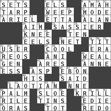 ACROSS 1. Puts into a specified state 5. Raised railways 8. Nanny 12. Canvas cover 13. Shed a tear 15. Method 16. Satellite of Uranus 18. Singer James 19. Actor Alda or Thicke 20. Direct toward a target or goal 22. More lively and spirited 24. Leg joint 26. "___ Little Indians" 27. Snakelike fish 28. Fish or hair follower 29. Teat (slang) 32. One who uses or employs something 35. Calm and collected 37. Period 38. Vintage cars 39. Black tropical American cuckoo 40. Welt 41. Commissioned military rank (abbr.) 42. Ancient Greek god of war 43. Queen of England 1702-14 44. Curvy letter 45. Cleo's killer 46. Inky black, to poets 49. Part of HMS, perhaps 50. Expressed in words 51. Of or relating to Laos or its people 55. Compass dir. 56. Inside of hand 57. A type of plum 59. The principal food of baleen whales 63. Cause heat under the collar 64. Airtight sealed metal containers 65. Singer Brickell 66. Mouths or openings 67. Small child 68. Redecorate DOWN 1. R.R. building 2. Hearing organ 3. Three (prefix) 4. Orators 5. She-sheep 6. Allows 7. Bristle 8. At full speed 9. Undercover agent 10. The sixth month of the Jewish calendar 11. Layer 14. Soft color 17. Actor's bit 21. Cartoonist voice _ Blanc 23. Put into a specified state 25. Fortification 28. Annoying sounds 29. Adolescent 30. SW Asia republic 31. Falsehood 32. Goad 33. Perceives with the eye 34. Immeasurably long periods of time 36. Single 40. Roamer 42. Help 45. Small island 47. Prohibit 48. Pig sound 49. Dwellings 51. Den 52. Silent film actress Nazimova 53. Came down and settled, as after flight 54. Words to Nanette 56. Adept person 58. Eastern Standard Time (abbr.) 60. Binary compound 61. Flaplike covering 62. Lion