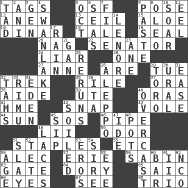 ACROSS 1. Labels 5. Order of Saint Francis (abbr.) 8. Introduce or present, as a question 12. Afresh 13. To provide with a ceiling 15. Medicinal plant 16. Middle Eastern gold or silver currency 18. Story 19. Lick closed 20. Tired old horse 22. Elected representative 24. One who doesn't tell the truth 26. Single 27. Queen of England 1702-14 28. "We ___ not amused" (Victoria) 29. Third day of the wk. 32. Long journey 35. Cause heat under the collar 37. Mouth or opening 38. Assistant 39. Shoshoni 40. Mouths or openings 41. Madame (abbr.) 42. Fastener 43. Grand slam 44. Player for Phoenix 45. Mayday 46. Corncob 49. Cards in a Roman deck? 50. Aroma 51. Paper fasteners 55. And so on (abbr.) 56. Actor Baldwin 57. One of the Great Lakes 59. Unit of acoustic absorption 63. Yard entry 64. Dinghy 65. Ketch in the Levant 66. Sight organs 67. Observe 68. Musical group of three DOWN 1. Bit 2. Black tropical American cuckoo 3. Commissioned military rank (abbr.) 4. Tchaikovsky ballet 5. Sep. follower 6. Oceans 7. Do some clerical work 8. Thick mixture 9. Butter sub 10. Fly high 11. Snakelike fish 14. Poe poem 17. Precipitation 21. Separate the seeds from cotton 23. A saturated hydrocarbon 25. Summer TV shows 28. City in Syria 29. "Corrida" creature 30. Mountain range 31. Comfort 32. Scottish caps 33. Tall New Zealand timber tree 34. Locale of original sin 36. Call ___ day 40. Cloudy 42. Dirtied 45. Small drink 47. Binary compound 48. Plant holders 49. Shoestrings 51. Kill 52. False hair 53. Greek god of love 54. The founder of a family 56. Personal question 58. Sight organ 60. Long, evenly shaped piece 61. One more than two 62. Non-commissioned officer (abbr.)