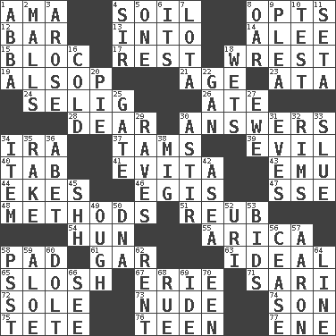 ACROSS 1. Nursemaid (var.) 4. The visible part of the earth's surface 8. Elects 12. Long, evenly shaped piece 13. To the inside or interior of 14. Toward shelter 15. Alliance 17. Respite 18. Obtain by seizing forcibly or violently 19. Columnist Joseph or Stewart 21. Mature 23. "One Day ___ Time" 24. Major League Baseball Commissioner Bud 26. Had dinner 28. Letter starter 30. Responds (to) 34. Lyricist Gershwin 37. Scottish caps 39. Tending to cause great harm 40. Keyboard key 41. Webber/Rice musical 43. Australian flightless bird 44. Supplements with great effort 46. Armor plate that protects the chest 47. Compass dir. 48. Modes 51. Reuben's nickname 54. Attila the _ 55. N. Chile seaport 58. Writing tablet 61. Slender fish 63. Perfect 65. Make a splashing sound 67. One of the Great Lakes 71. Indian skirt 72. Flatfish 73. Naked 74. Manchild 75. False hair 76. Adolescent 77. Compass dir. DOWN 1. Swedish rock group 2. Shopping centers 3. Came up 4. Title for a knight 5. Single 6. It is 7. Globular water bottle used in Asia 8. Boat paddle 9. Entreaty 10. Trial 11. Stalk of a moss capsule 16. Lacking warmth 18. Soaks 20. Sliced dessert 22. Separate the seeds from cotton 25. Yard entry 27. She-sheep 29. All-night dance parties 30. Being in motion 31. Nights before holidays 32. Basketball hoops 33. Turn sharply 34. Detail 35. Libertine 36. Collude with 38. Russian fighter aircraft 42. At sea 45. Quiet! 49. Ending for "Through" and "Enough" 50. Heredity factor (abbr.) 52. RI univ. 53. Auction offers 56. Desist 57. Composer Copland 58. Inconspicuous attention getter 59. Medicinal plant 60. Stupid person 62. Monthly bill 64. Actor's bit 66. Observe 68. Regret 69. Binary compound 70. Car or cant ending