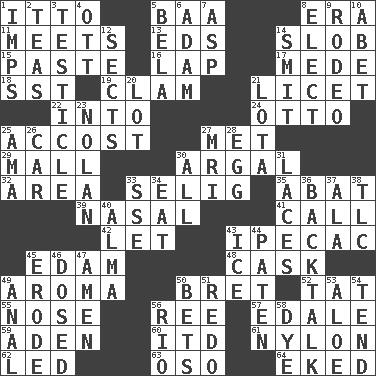 ACROSS 1. "Tell ____ the Marines!" 5. Sound made by sheep 8. Epoch 11. Confronts 13. Begley and Asner 14. Oscar Madison type 15. Thick mixture 16. Infant locale 17. Ancient Persian 18. Fast jet (abbr.) 19. Dollar (slang) 21. It is permitted: Lat. 22. To the inside or interior of 24. Von Bismarck 25. Buttonhole 27. Was introduced to 29. Promenade 30. Therefore, facetiously 32. Type of rug 33. Major League Baseball Commissioner Bud 35. Blind as ____ 39. Rhinal 41. Give a ring to 42. Allow 43. Medicinal drug used to evoke vomiting 45. Dutch treat 48. Keg 49. Odor 50. Cy Young winner Saberhagen 52. Make lace 55. Sense of smell 56. To separate or throw off 57. Peak District village in England 59. Arabian gulf 60. It would 61. Thermoplastic polyamide 62. Directed 63. Bear (Spanish) 64. Supplemented with great effort DOWN 1. Naughty children 2. Afternoon social gatherings 3. One of the two male reproductive glands 4. Baseball player Mel 5. Actor Lugosi 6. First man 7. Viper 8. Voters do this 9. Cowboy competition 10. Collude with 12. Religious groups 14. Stricken, poetically 20. Car dealer's back yard 21. Globular water bottle used in Asia 23. Pitcher Ryan 25. Housemaid (var.) 26. Automobile 27. Medical imaging device (abbr.) 28. Oval reproductive body of a fowl 30. 100% 31. Shoestrings 33. Compass dir. 34. Erode 36. Sass 37. Insect wing 38. Affectionate concern, for short 40. _ mater 43. Frozen water 44. Eucharist need 45. Wear away 46. Administered medicine 47. So be it 49. Of or related to the anus 50. Stakes 51. Make new 53. _ vera 54. Watch over 56. _ de Janeiro 58. Color