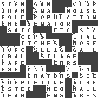 ACROSS 1. Omen 5. Separate the seeds from cotton 8. Hoof sound 12. SW Asia republic 13. Santa ___, CA 14. Annoying sound 15. Hero or heavy, e.g. 16. Census information 19. Compass dir. 20. Elected representative 21. Ketch in the Levant 23. And so on (abbr.) 24. Ocean 27. 911 reaches them 30. Slanted text style (abbr.) 31. Irritating cutaneous sensations 34. Characteristic smell of wine 35. Torque (variant) 38. Major League Baseball Commissioner Bud 40. Yard entry 41. Taken by mouth 42. Fodder prepared in a silo 44. Cause to be 45. Blunders 46. Compass dir. 47. Floor covering 50. Smallest unit of an element 53. Speakers 57. Observe 59. Supplying deficiencies 63. Land measure 64. First name in cosmetics 65. Modern: prefix 66. Promenade 67. Lacerate 68. Followers of ems 69. Ancient Greek god of war DOWN 1. The founder of a family 2. Removes the wrinkles 3. An organ shaped like a helmet 4. Compass dir. 5. Open wide 6. Soon (poet.) 7. California wine valley 8. Small bed 9. Cards in a Roman deck? 10. Bear (Spanish) 11. Animal enclosure 14. Drug cop 17. Shoshoni 18. Car dealer's back yard 20. Highlander 22. Tapering mass of hanging ice 24. Portico 25. 90 degrees 26. Toward shelter 28. Personal Computers (abbr.) 29. "______ My Girl" (Turtles hit) 30. Swallow 32. Biblical high priest 33. Filth; sediment 35. Heavy book 36. Mouths or openings 37. Libertine 39. Slender fish 43. Pate de foie ____ 47. Undercover agent 48. "We ___ not amused" (Victoria) 49. Make lace 51. Motion picture award 52. Haggard of country music 54. Prong on a fork 55. Baking chamber 56. Vintage cars 58. Snakelike fish 59. Put into a specified state 60. Purpose 61. Parent Teacher Association (abbr.) 62. For each 63. Nursemaid (var.)