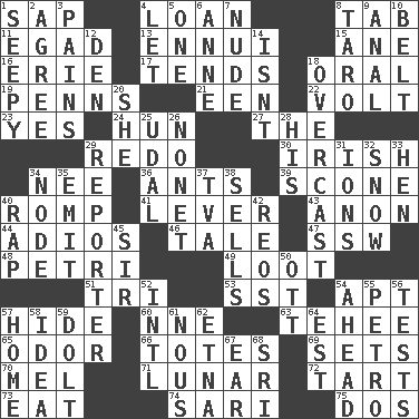 ACROSS 1. Plant excrement 4. Grant temporary use of 8. Keyboard key 11. Mild oath 13. World-weariness 15. A saturated hydrocarbon 16. 4th largest of the Great Lakes 17. Watches over 18. Relating to the mouth 19. Actor Sean's family 21. Car or cant ending 22. Electrical Unit 23. Consenting reply 24. Attila the _ 27. Definite Article 29. Do over again 30. From or relating to Ireland 34. Born 36. Pismires 39. Biscuitlike quick bread 40. Frolic 41. Crowbar 43. Soon (poet.) 44. Goodbye (Sp.) 46. Falsehood 47. Compass dir. 48. _ dish (used to culture cells) 49. Spoils 51. Three (prefix) 53. Fast jet (abbr.) 54. Fitting 57. Flintstone garb 60. Compass dir. 63. Giggle 65. Aroma 66. Lugs 69. Arranges properly for use 70. Cartoonist voice _ Blanc 71. Type of eclipse 72. Small pie 73. Erode 74. Indian skirt 75. Two (Sp.) DOWN 1. Oozy 2. Match 3. Aches 4. Allow 5. Single 6. Singer Murray 7. Naked 8. Edible starchy tuberous root 9. Of or related to the anus 10. Waist strap 12. Lair 14. Is not 18. Cloudy 20. A female animal or person 25. Hereditary estate 26. Music written for nine 28. Part of HMS, perhaps 29. News announcer 31. Charged atoms 32. Overwhelm 33. Layer 34. Connecting point 35. Send forth 37. Federal power corp. 38. Exchanges for money 40. Reproach for some lapse or misdeed 42. Vintage cars 45. Title for a knight 50. Baseball player Mel 52. International (abbr.) 54. Toward the future 55. Stone: prefix 56. Trials 57. Residence 58. The main thing one is thinking about 59. Stupid person 61. Good sense 62. Inactive volcano in Sicily 64. Eastern Standard Time (abbr.) 67. Hearing organ 68. Indian title of respect (Mr.)