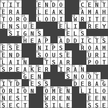 ACROSS 1. Teat (slang) 4. Inside; within (prefix) 8. Penny 12. Epoch 13. Path through which fluid escapes 14. Nursemaid 15. "Corrida" creature 17. Farming town in central California 18. Compose 19. Take place subsequently 21. Connecticut Ivy Leaguer 23. Marina Del _, California 24. Signals 26. Raised railways 28. Pile 30. Inveterate users 34. Compass dir. 37. Pinches, bites 39. Wander 40. Conclusion 41. Boozer 43. RI univ. 44. (Had) reclined 46. Russian ruler of old 47. Plant holder 48. Orator 51. SW Asia republic 54. Commissioned military rank (abbr.) 55. Snob 58. It would 61. Curvy letter 63. Debunk (Brit. slang) 65. Constellation of myth 67. Presage 71. _ and Stitch 72. A home for chicks 73. Songbird 74. Car or cant ending 75. Religious group 76. Filth; sediment 77. Compass dir. DOWN 1. False hair 2. Metal shackles 3. Tarsus (plural) 4. Pipe bend 5. Modern: prefix 6. June honoree 7. Migrant worker of the '30s 8. Automobile 9. Arab leader 10. Nathan's nickname 11. Those things 16. Ending for "Through" and "Enough" 18. Uncontrolled 20. Compass dir. 22. Directed 25. Without 27. Title for a knight 29. Peter (Polish) 30. Slender Brazilian palm 31. Overturn; upset 32. Pacific island yam 33. Stricken, poetically 34. Snakelike fish 35. Fastener 36. Singer Brickell 38. Fluid product of inflammation 42. Blunders 45. Tired old horse 49. Peachy ____! 50. Followers of ems 52. Also 53. Christmas carol 56. Off-Broadway awards 57. Lies 58. Charged atoms 59. Family _ (genealogy) 60. Compact _ 62. Sty mamas 64. Went 66. Baseball player Mel 68. Medical imaging device (abbr.) 69. Snakelike fish 70. Compass dir.