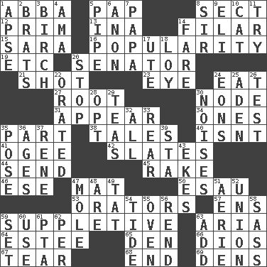 ACROSS 1. Swedish rock group 5. Infant food 8. Religious group 12. Demure 13. _ tizzy (2 wds.) 14. Of or pertaining to a thread or threads 15. "Two Mules for Sister ____" 16. Teen's desire 19. And so on (abbr.) 20. Legislator 21. Went for two points 23. Sight organ 24. Consume 27. Carrot, for example 30. Connecting point 31. Seem 34. Singles 35. Role in a play 38. Stories 40. Is not 41. Double curve, resembling the letter S 42. Chalkboards 44. Post 45. Libertine 46. Compass dir. 47. Floor protector 50. Son of Isaac 53. Speakers 57. Followers of ems 59. Supplementary 63. Operatic vocal solo 64. First name in cosmetics 65. Lair 66. "Vaya con ____" 67. Rend 68. Conclusion 69. Lairs DOWN 1. Domed church section 2. Naughty children 3. A tree used for making furniture 4. Wet nurse (var.) 5. Corncob 6. At once, immediately (arch.) 7. Dad 8. Title for a knight 9. Biblical high priest 10. Domesticated feline 11. Attempt 14. Conductor's collection 17. Shoshoni 18. Myrna of the movies 20. Cease 22. Declaimed 24. Immeasurably long periods of time 25. Arabian gulf 26. Trial 28. Elect 29. Beverages made from leaves 30. Annoying sounds 32. Everything 33. Located in or toward the back 35. Introduce or present, as a question 36. Grows older 37. French philosopher Descartes 39. R.R. building 43. Supplements with great effort 47. Undercover agent 48. "We ___ not amused" (Victoria) 49. Make lace 51. Nest on high 52. The state of being joined or united 54. Periodic rise and fall of the sea level 55. Baking chamber 56. Tear apart 58. Backtalk 59. Put into a specified state 60. Purpose 61. Parent Teacher Association (abbr.) 62. For each 63. Increase